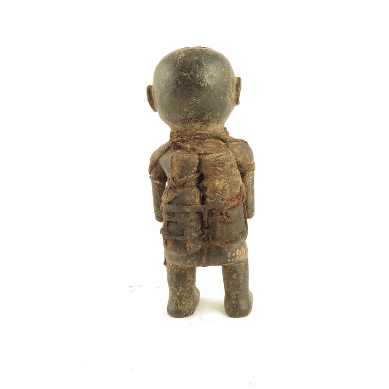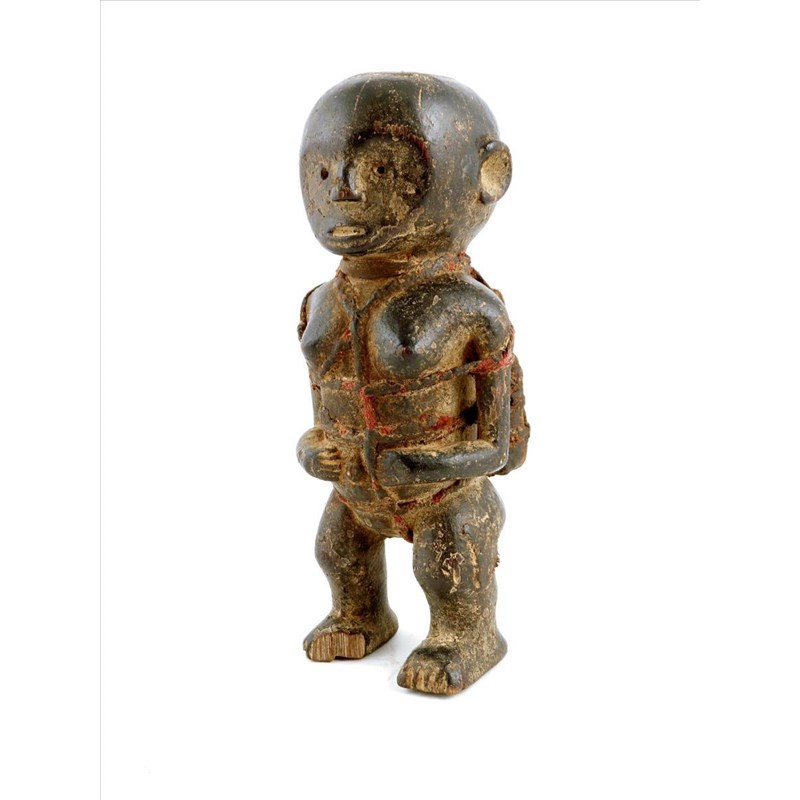 A Pare standing female figure, Tanzania, with two sealed bottles strapped to her back, 27.7cm high.