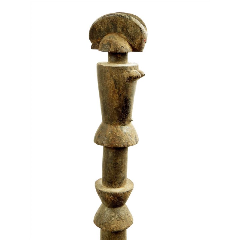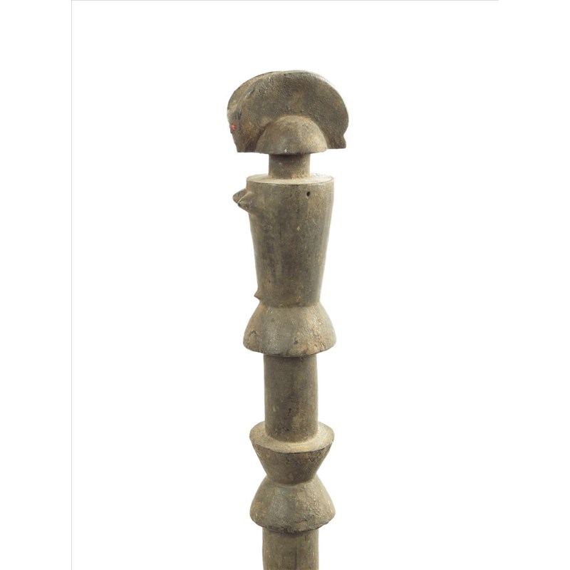 A Tanzanian staff, with stylised female figure terminal, inset bead eyes, with black encrusted patination, 107.5cm high and later stand.