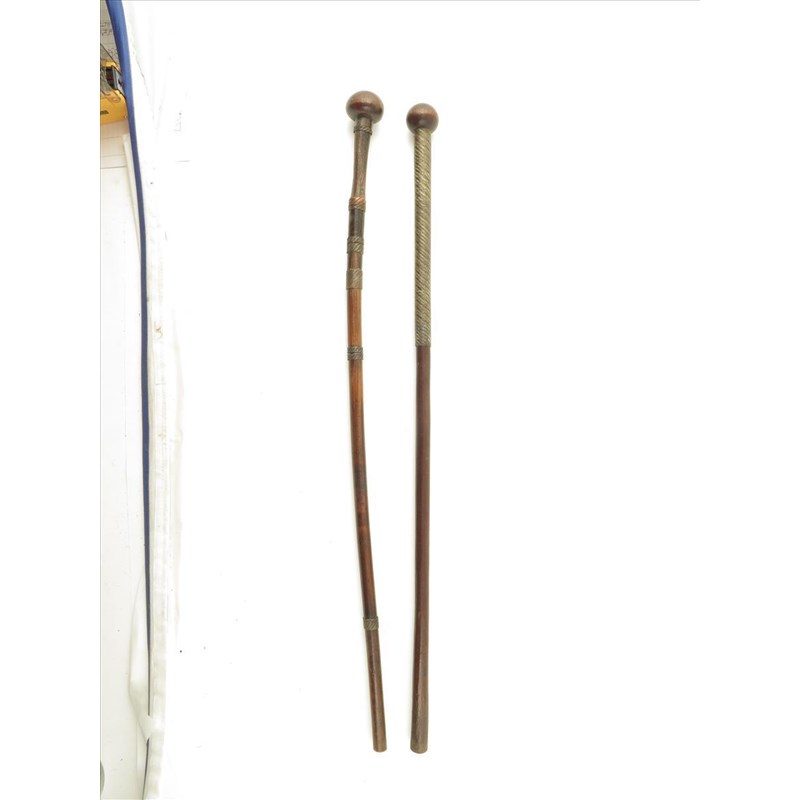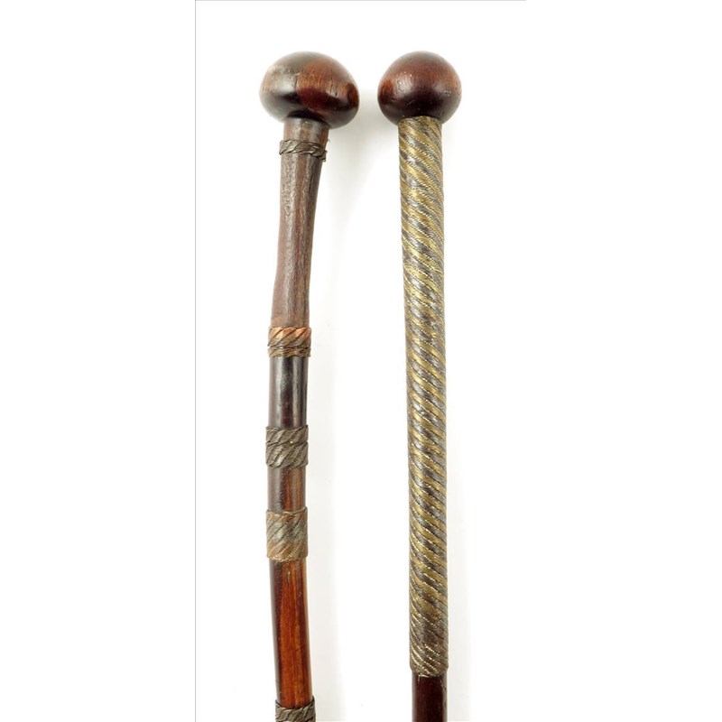 A Zulu wood staff, with knop finial and and two colour wire handle, 79.5cm long and a Zulu wood staff, with wirework bands, 80.6cm long. (2)