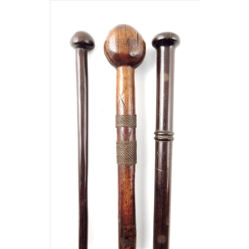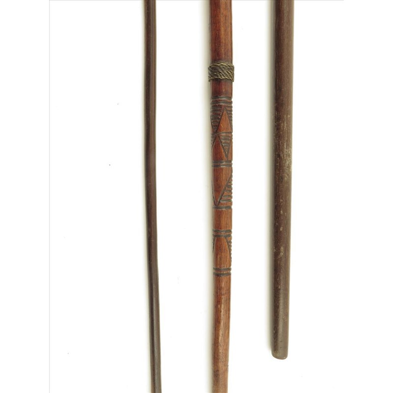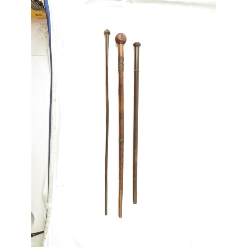 A South African wood staff, with incised decoration and bands of wire, 19th century, 86cm long, a staff with knop finial, 87cm long and a cane with twin ring shoulder and flattened knop finial, 75.5cm long. (3)