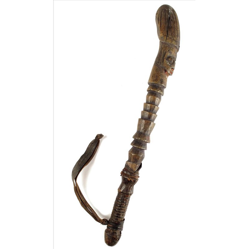 A Yoruba staff, carved a mask with pointed coiffure, the leather bound handle, 21¾in (54.2cm) long.