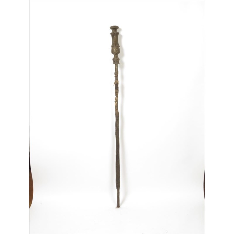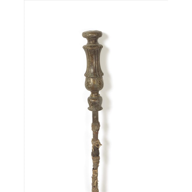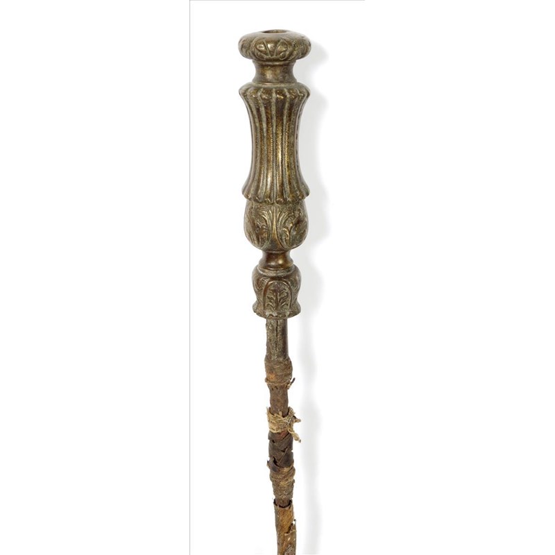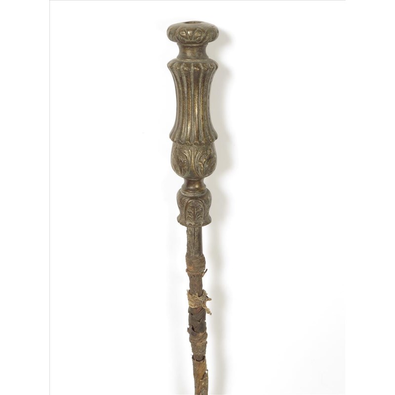 A Sierra Leone staff, with a European bronze candlstick on a leather covered iron shaft, 132cm long.
