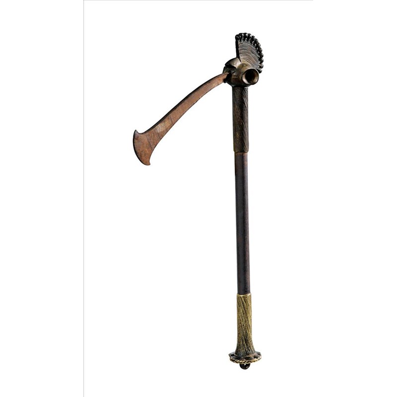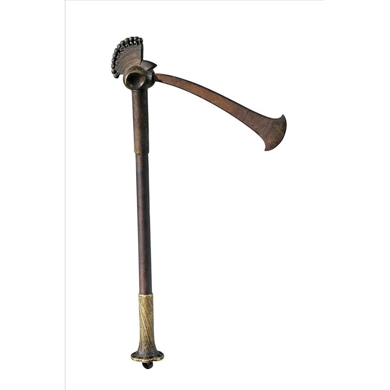 A Tiv ceremonial adze, Nigeria, with a stylised human head issuing a shaded blade, with brass grip, 50.5cm high.