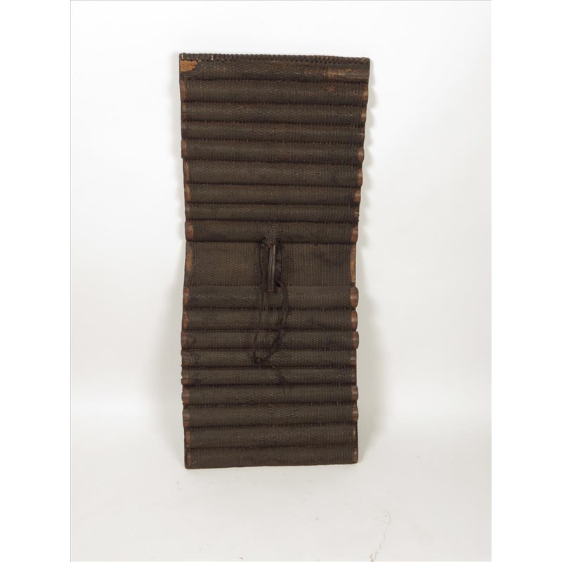 A Topoke shield, D. R. Congo, rectangular angled form with woven rattan and two metal plaques to one corner, the reverse with cut reed and rattan covered, with handle and painted finish, 98cm high.