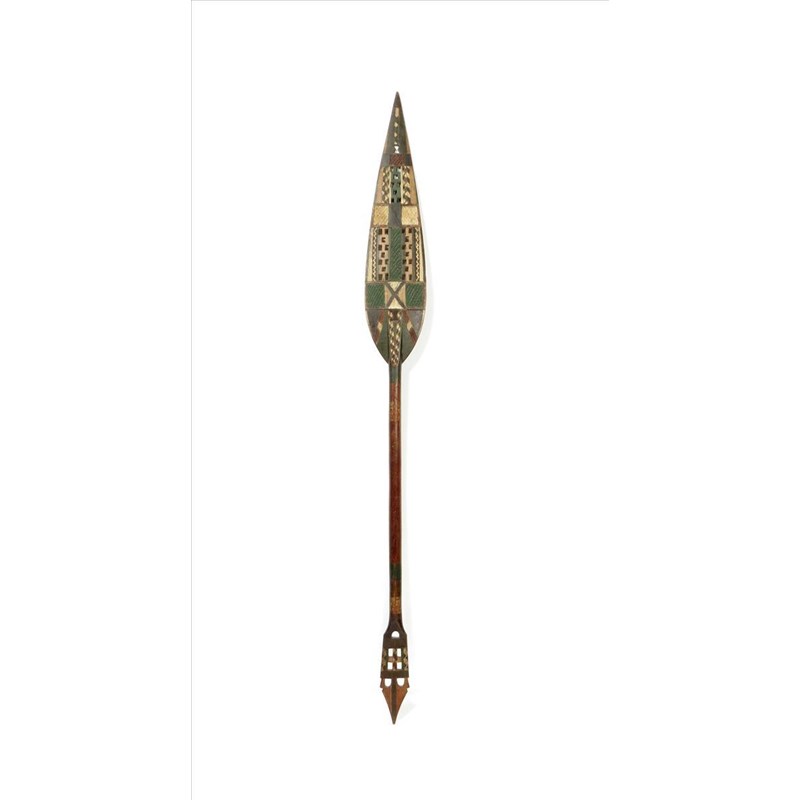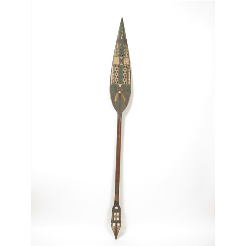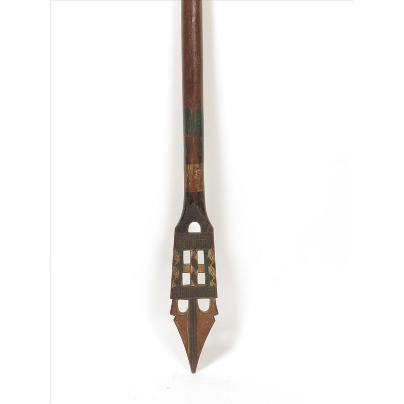 A Benin jekri paddle, pierced and later painted, 149.5cm long.
