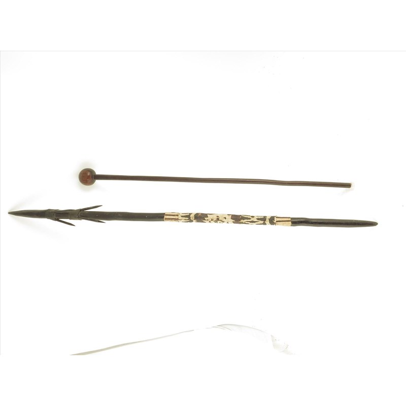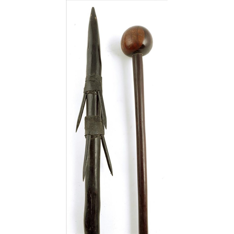 A South African knobkerrie, 85.5cm long, and a barbed spear with painted cloth grip, 108.5cm long. (2)