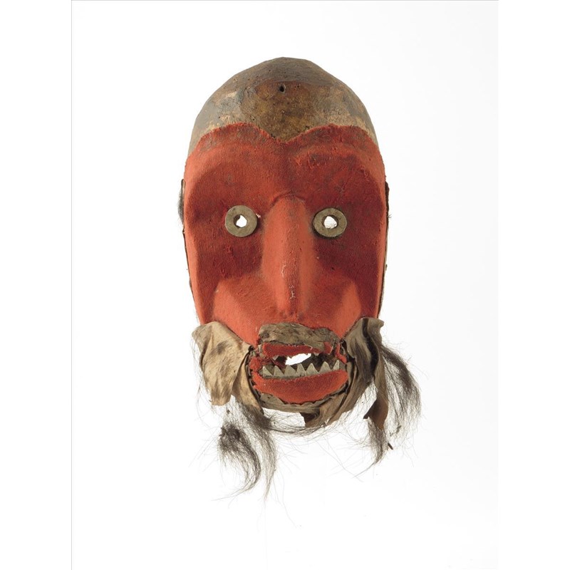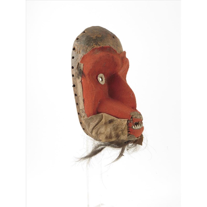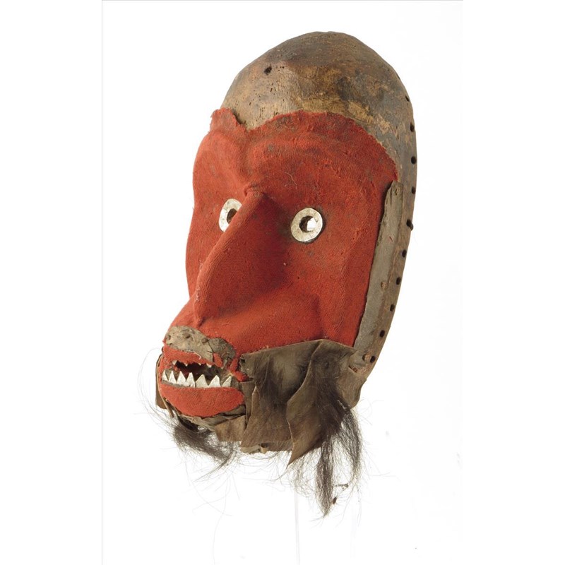 An Ivory Coast mask, Gere-Wobe, with red fabric, aluminium and hair beard, 28cm high.