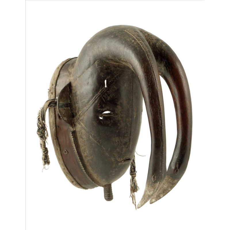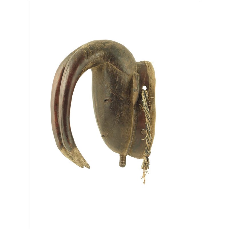 A Ligbi mask, Ivory Coast, with two hornbill issuing from the forehead, with cloth, 30cm high.