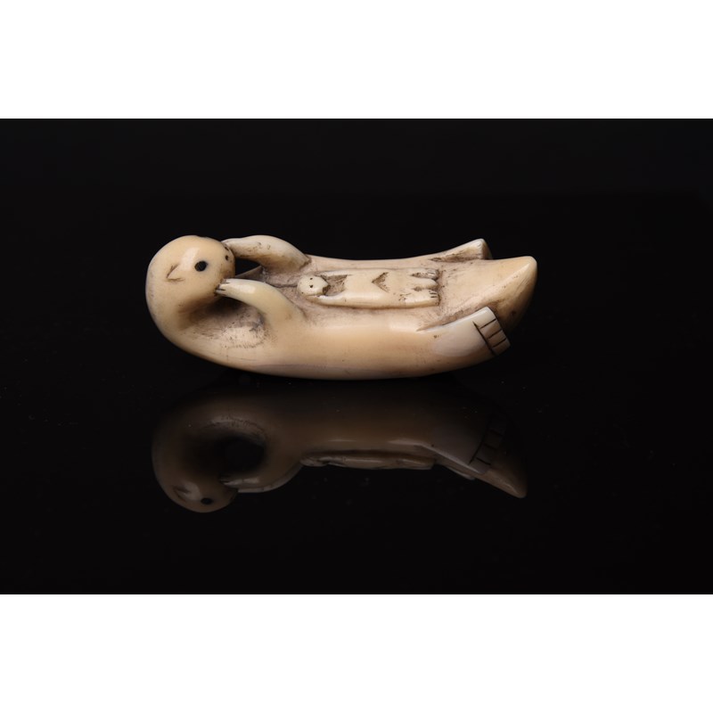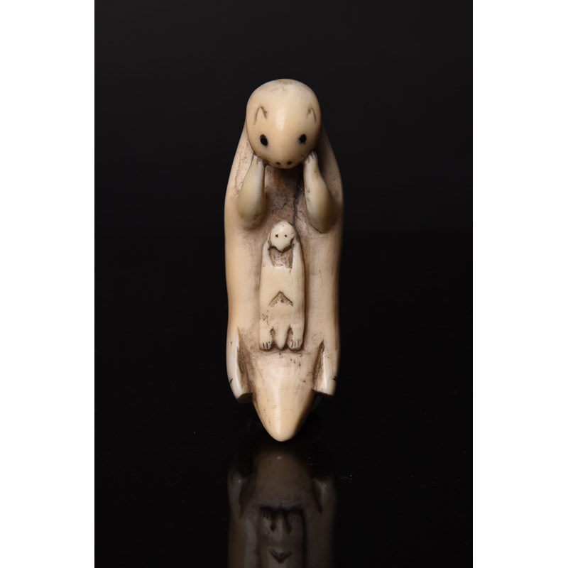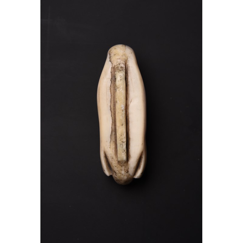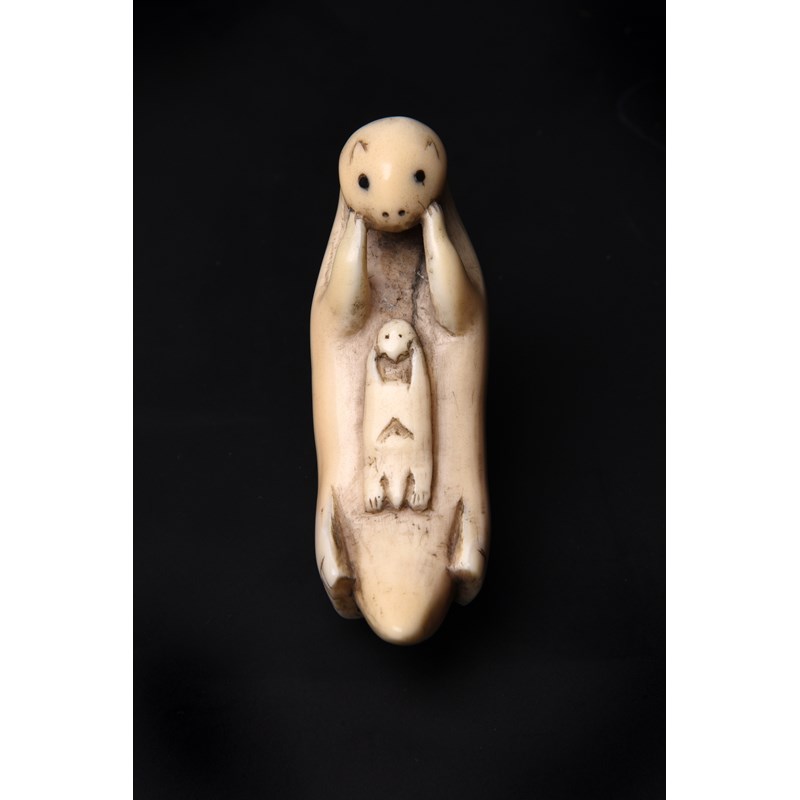 walrus ivory and baleen, both with their front paws to their faces, the pup with an inverted V, possibly ribs, the back with a ridge pierced either end for attachment,