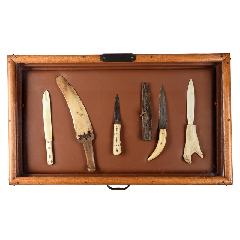 marine ivory, steel, brass, antler and sinew, including a snow knife with a walrus ivory handle and a sinew bound marine ivory curved blade, 32.5cm long; two with steel blades, 19.6cm and 24cm long, the larger with a leather scabbard with a belt hook; one with and antler handle, 26.9cm long and a one piece example with circle and dot decoration to the handle with red pigment fill, 24cm long, mounted in a case with a hinged glazed lid.