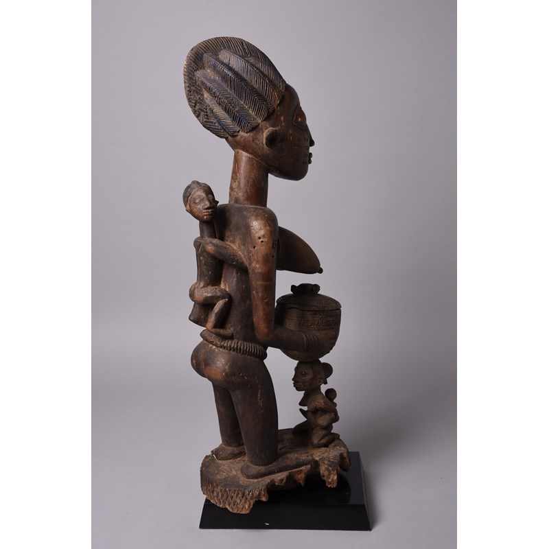 with a standing female figure with remains of Reckitt's Blue to her coiffure and with an infant on her back having raised triangle amulets on its back, the mother holding a bowl with a cover and supported by a kneeling maternal figure,