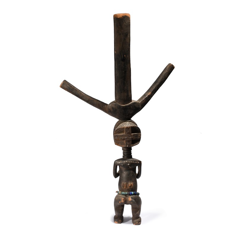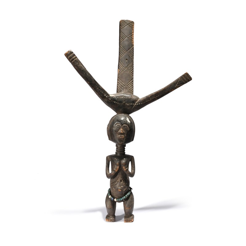 with inset white glass beads, the standing female figure with body scarifications and her hands to her breasts, with a cross back coiffure and a tripartite surmount,