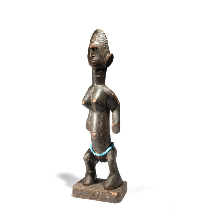 with carved decoration to the high coiffure, face, shoulder and abdomen, with nail eyes and a glass bead waistband,