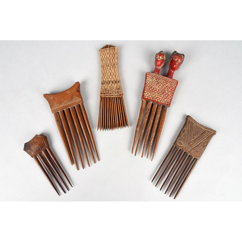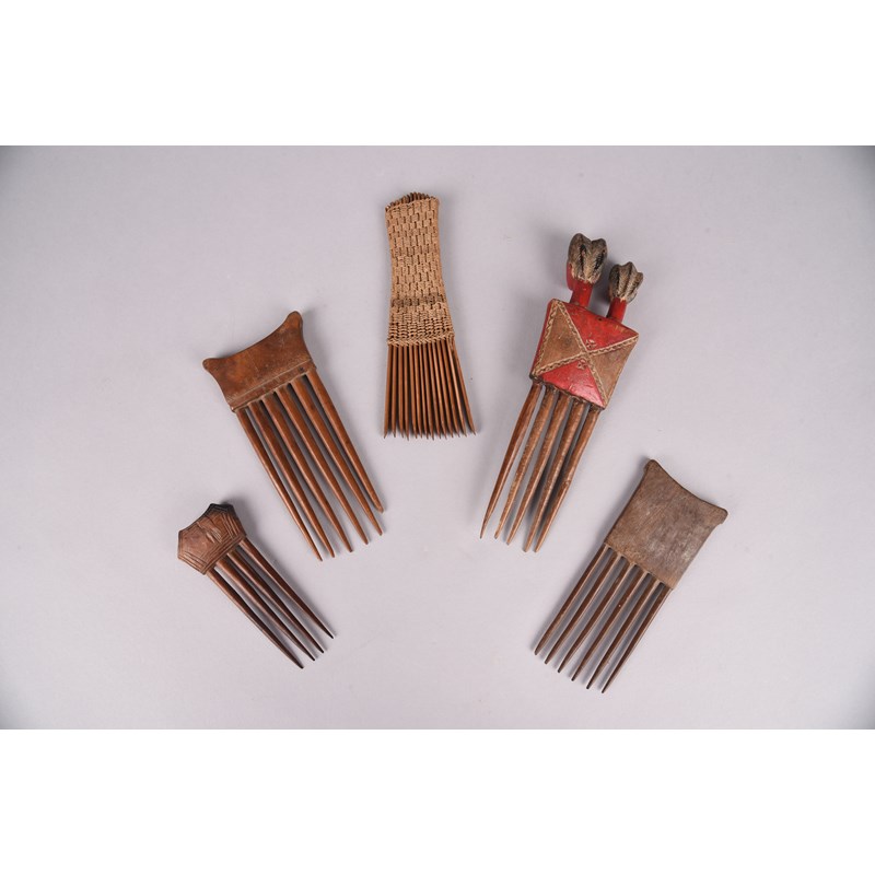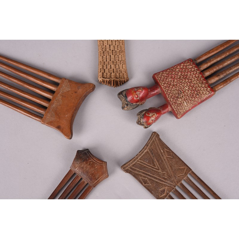 three Baule combs with carved decoration and a Mangbetu fibre bound comb. (5)
