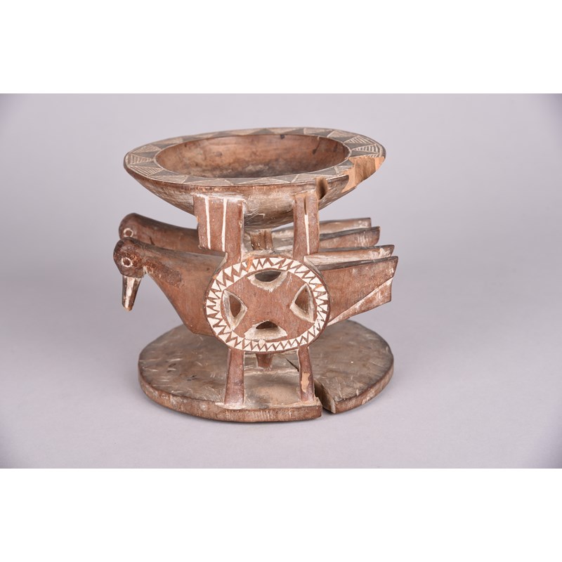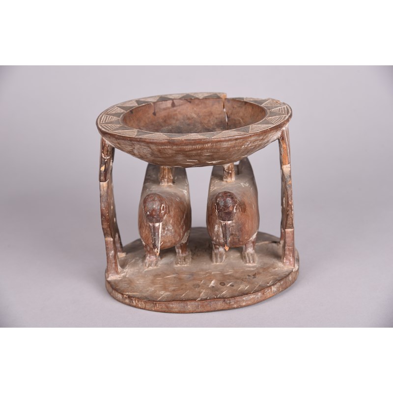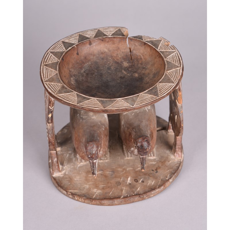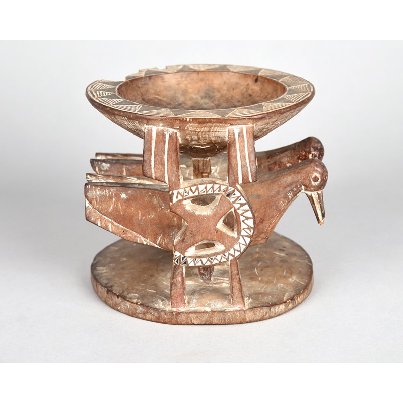 with a pair of carved birds and open supports, the bowl rim with chevron and linear carved decoration,