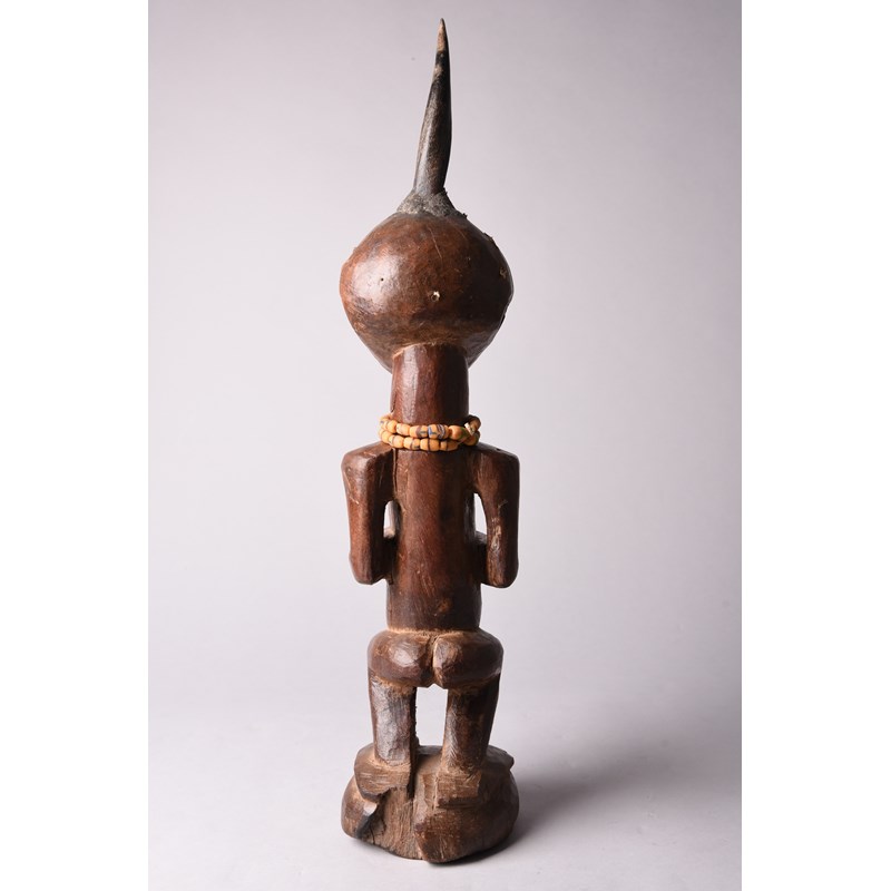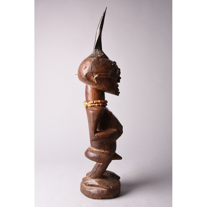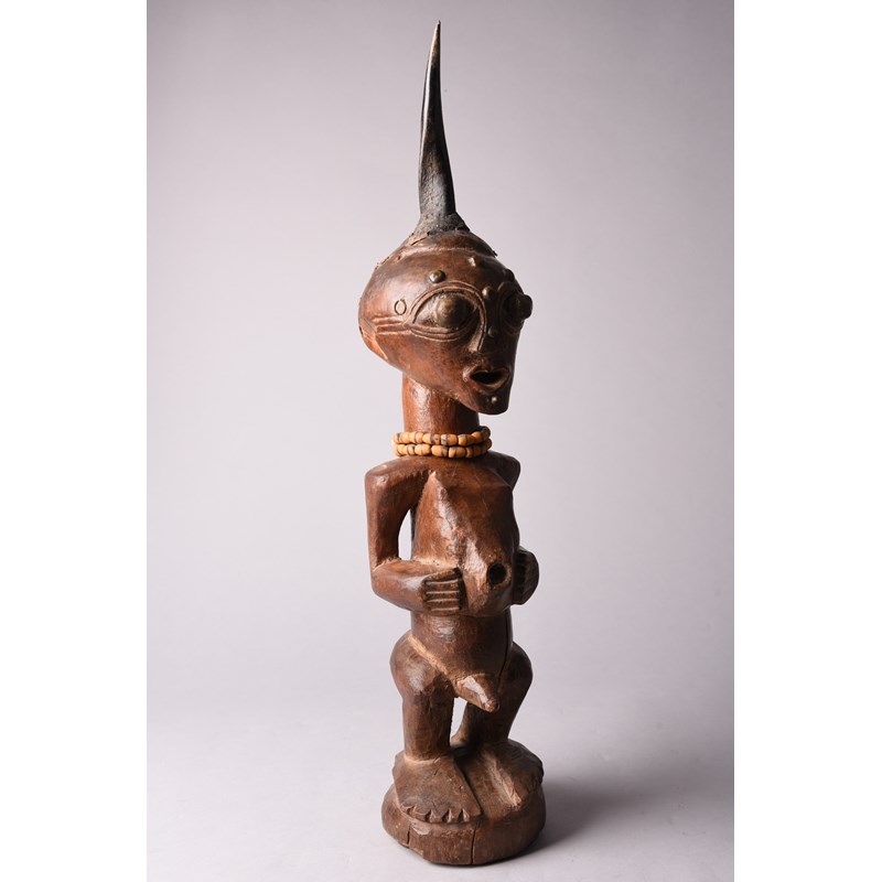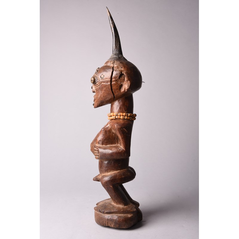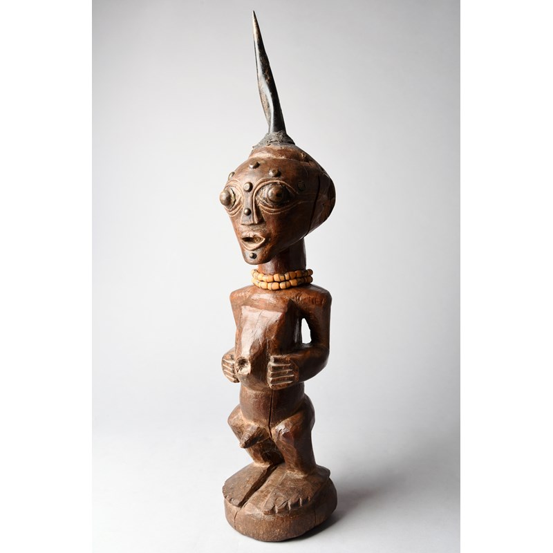 with an inset horn to the top of the head and with the remains of nails, the face with outlined eyes and nose, with applied brass studs and bulging brass eyes, with an open mouth, with a bead necklace, the abdomen with a recess previously with charge, standing on a domed base,