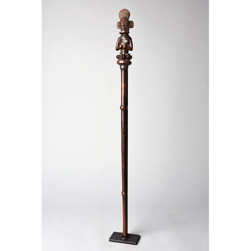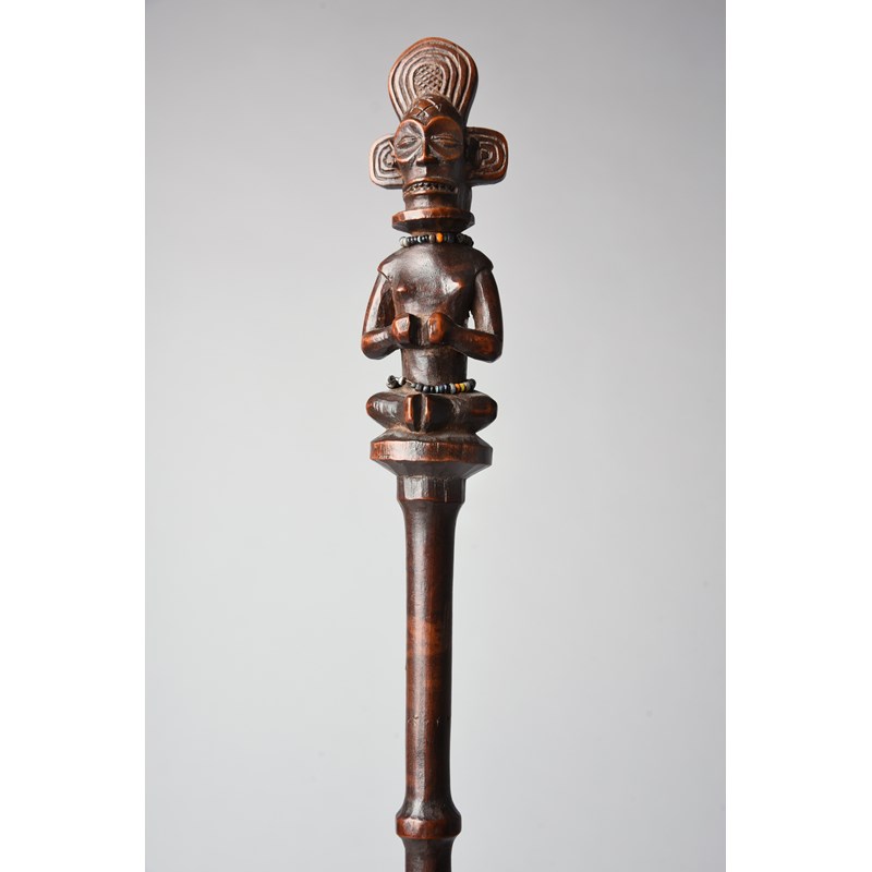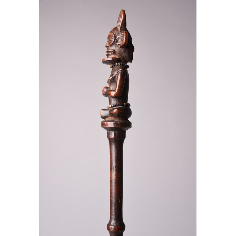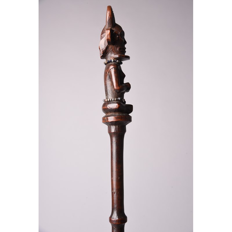 carved a seated ancestor figure wearing a cihongo mask and with glass beads, on a knopped shaft,