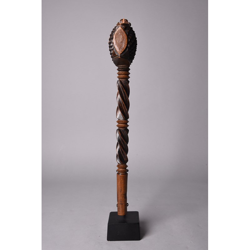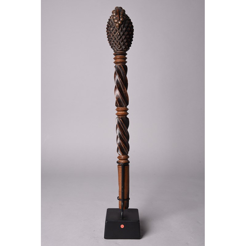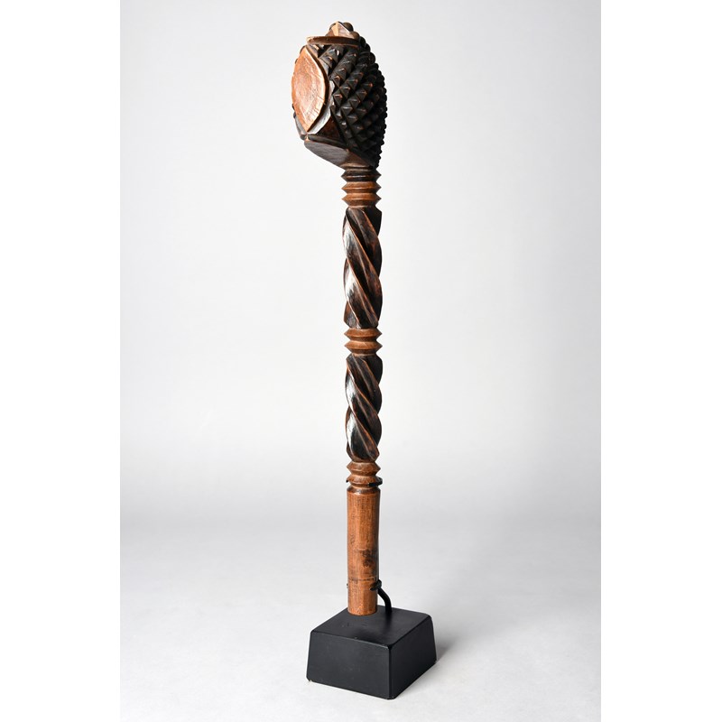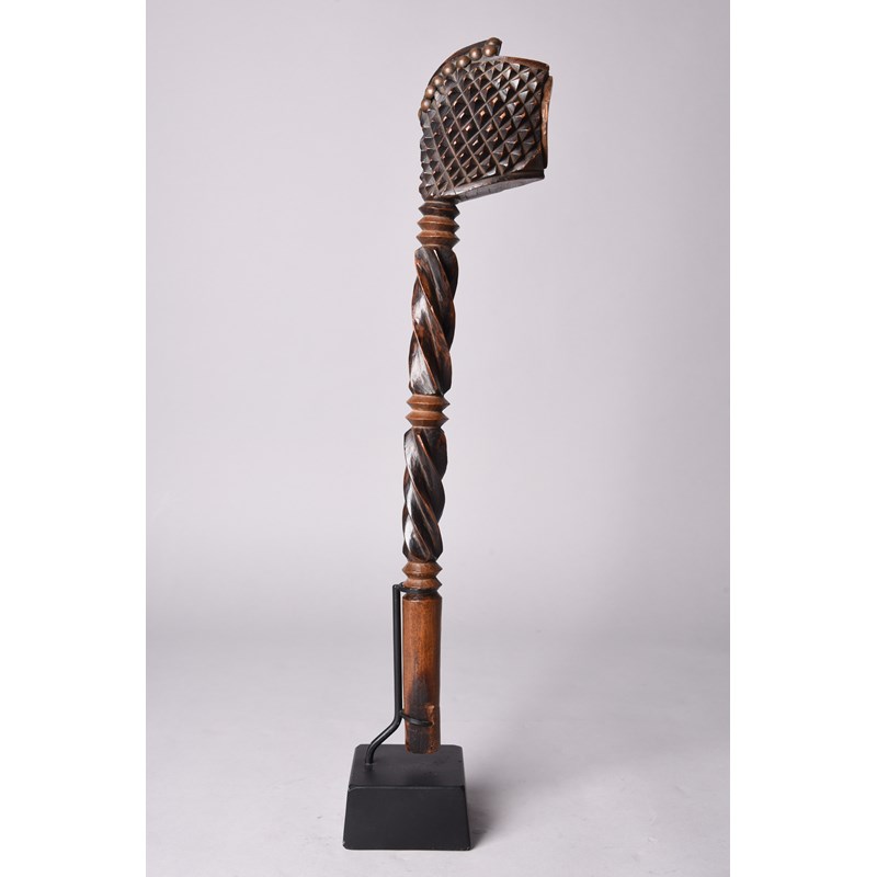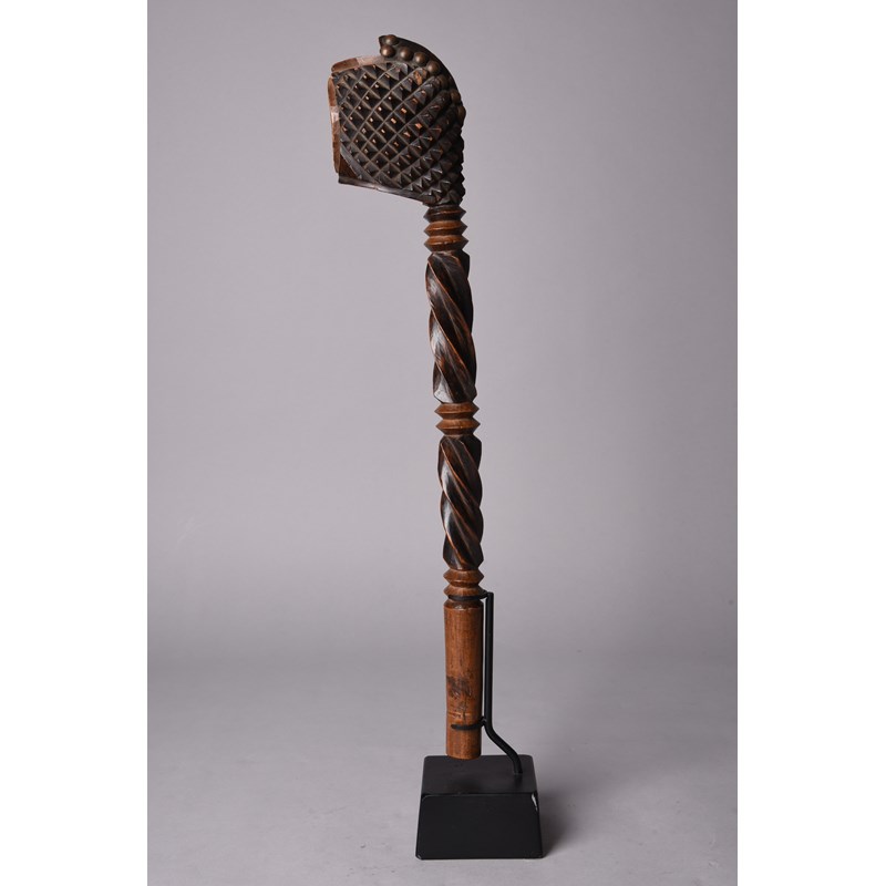 the stylised head with carved amasumpa and brass studs, on a knopped and spiraled handle, part ebonised, 19th century,