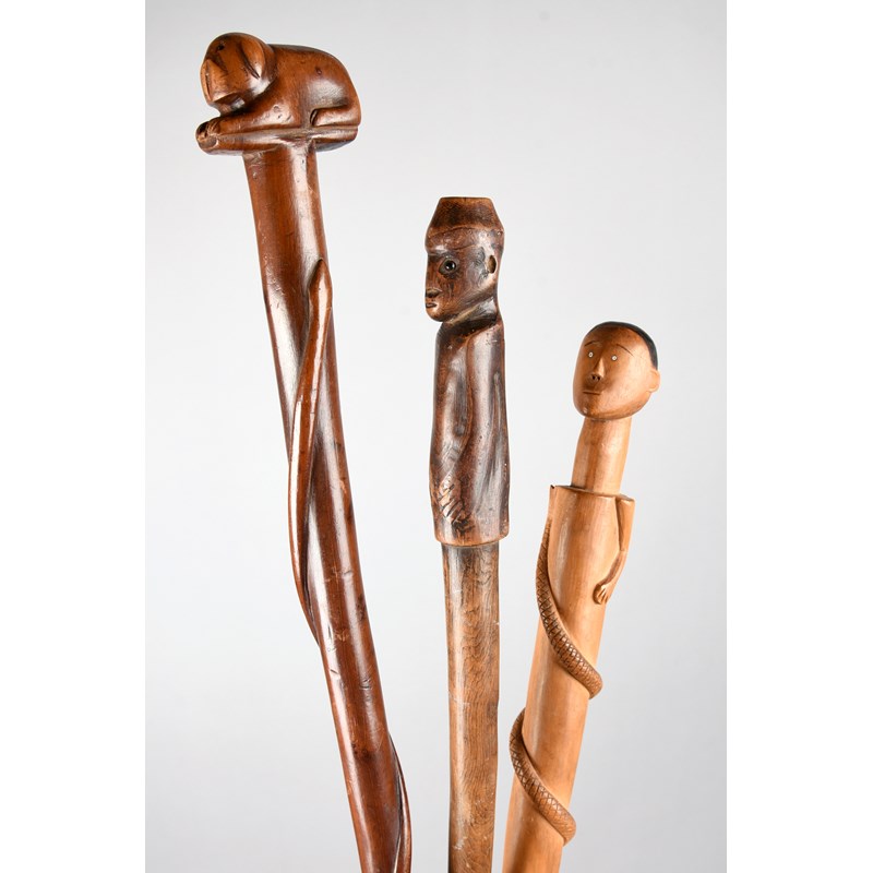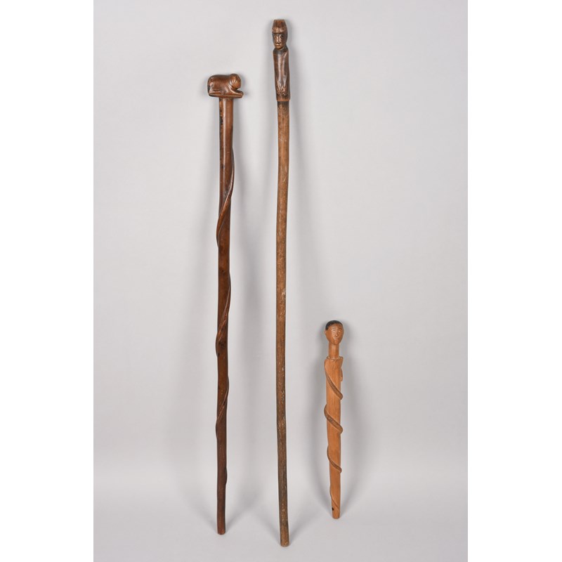 one with a reclining dog finial and a snake coiled around the shaft, 91cm long, and a half figure terminal with inset seed eyes, 100.2cm long and a Tsonga baton, with a head finial inset bead eyes, the shaft with his left arm and a coiled snake, 41.7cm long. (3)
