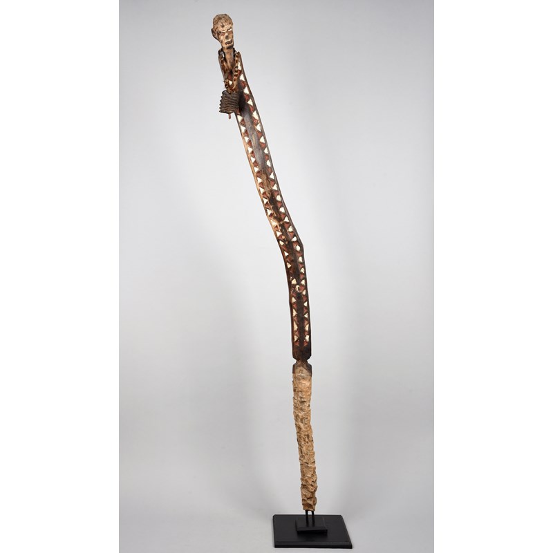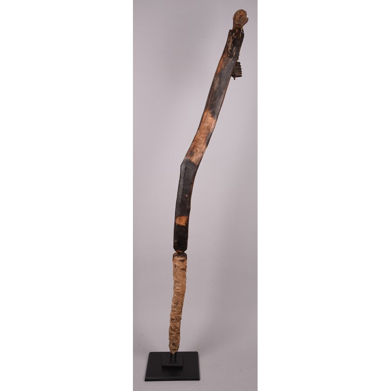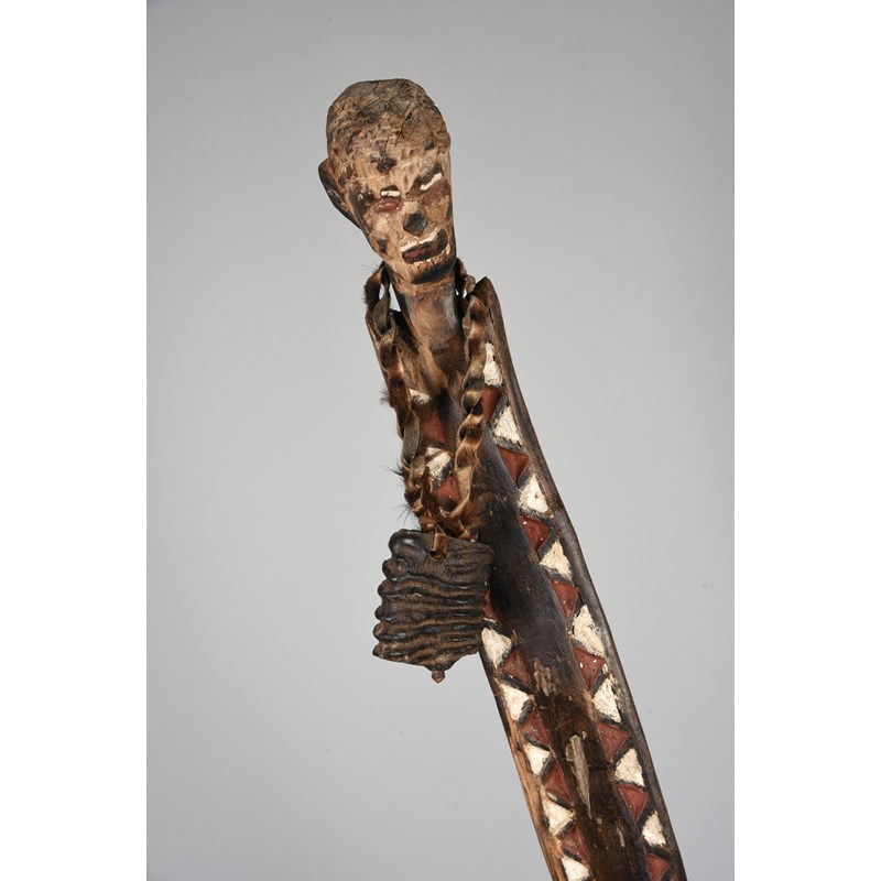 curved with a carved head finial and triangles to the body with red and white pigment, with a horn and hide bell hung around the neck,