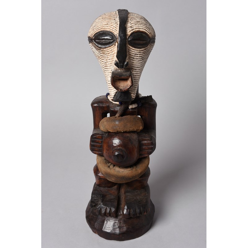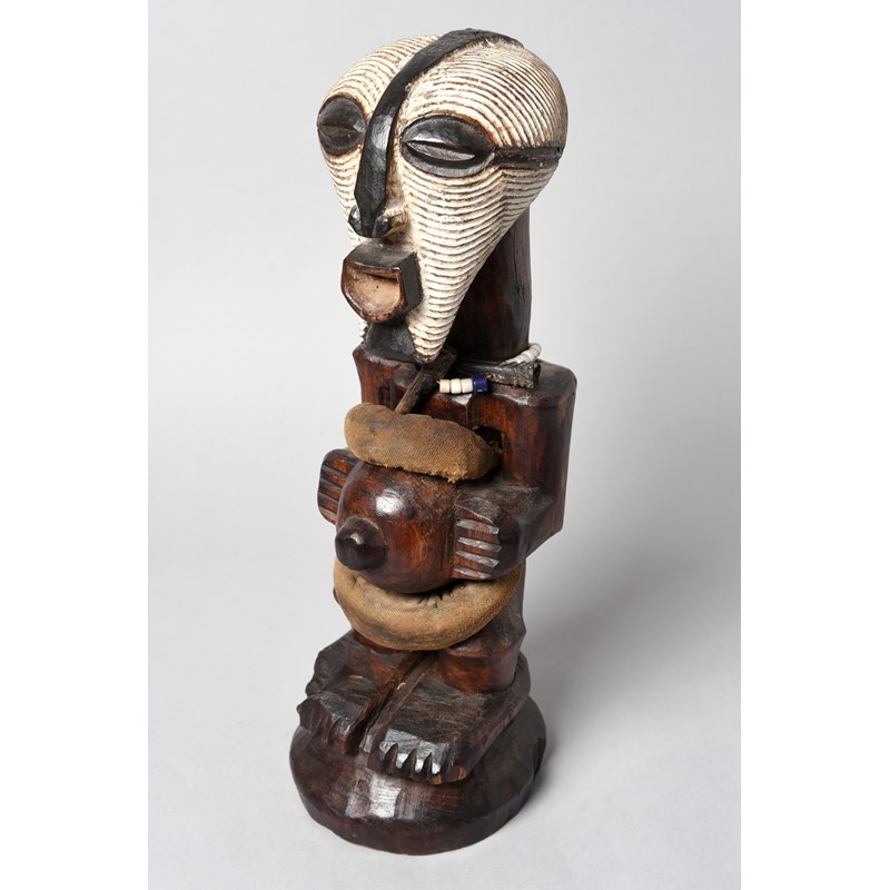 with a kifwebe mask, glass bead and horn necklace and cloth bound fibre bands,