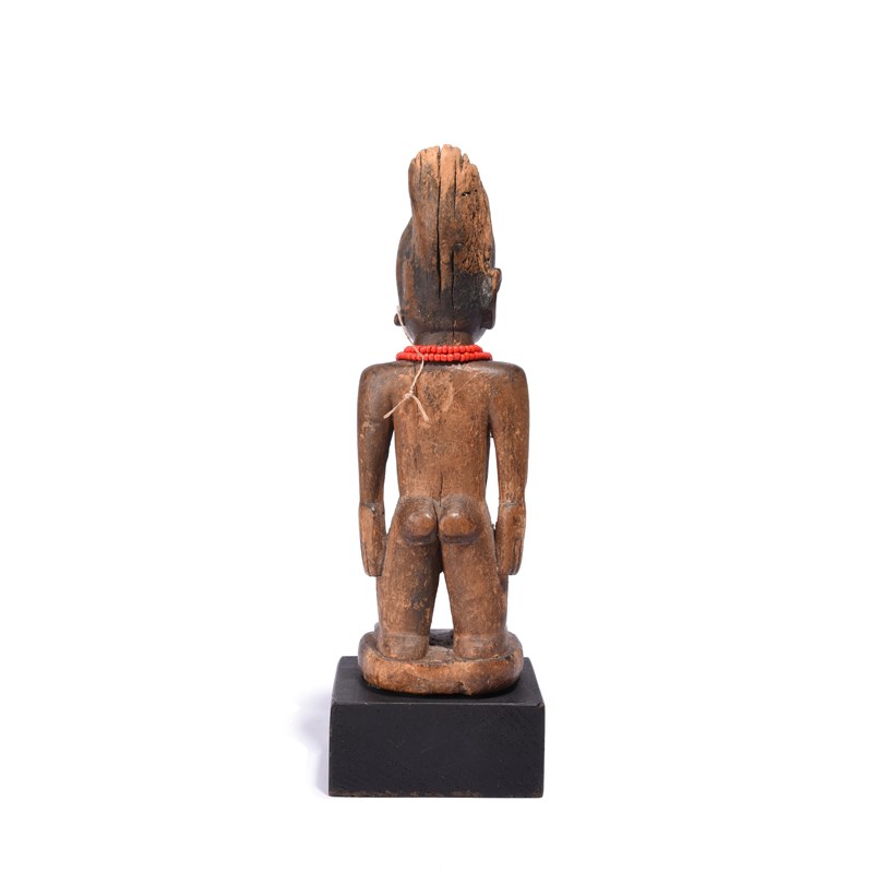 with facial scarifications and a metal pin to the right eye, wearing a red bead necklace,