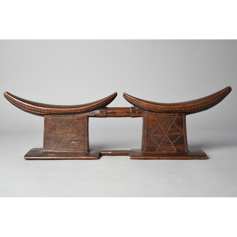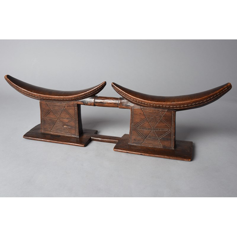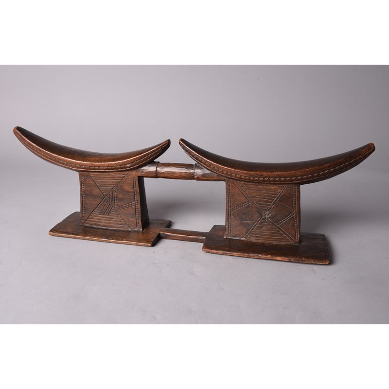 with slender elliptical tops having carved rows of lozenges on tapering block supports with incised linear decoration, united by bars,