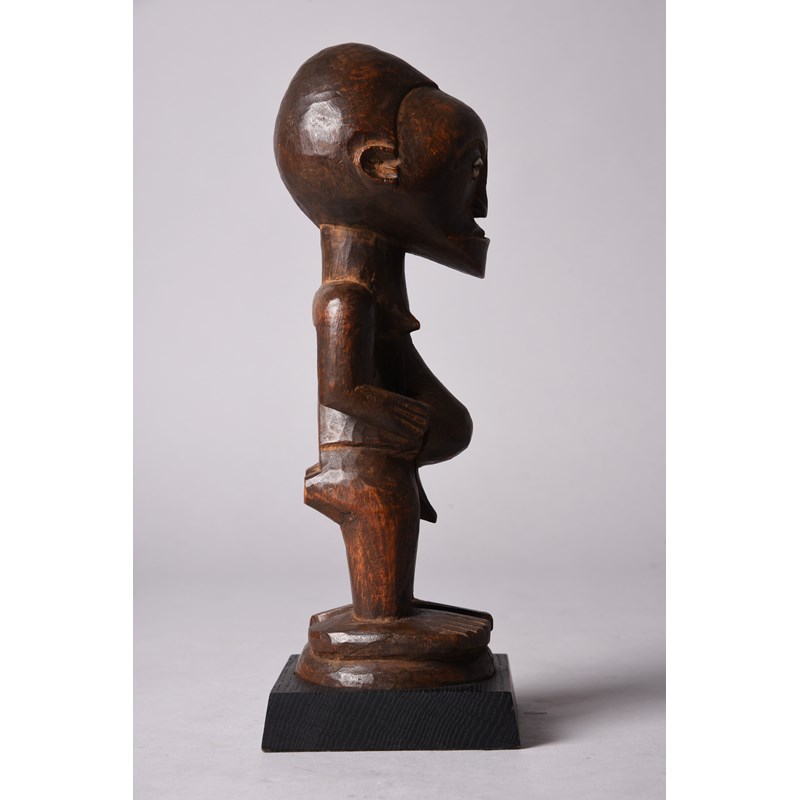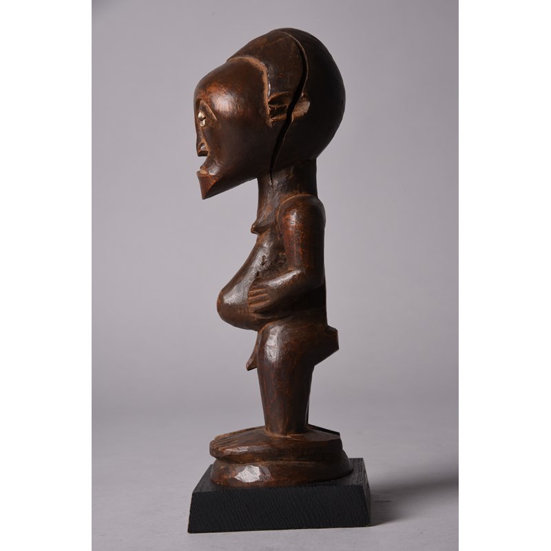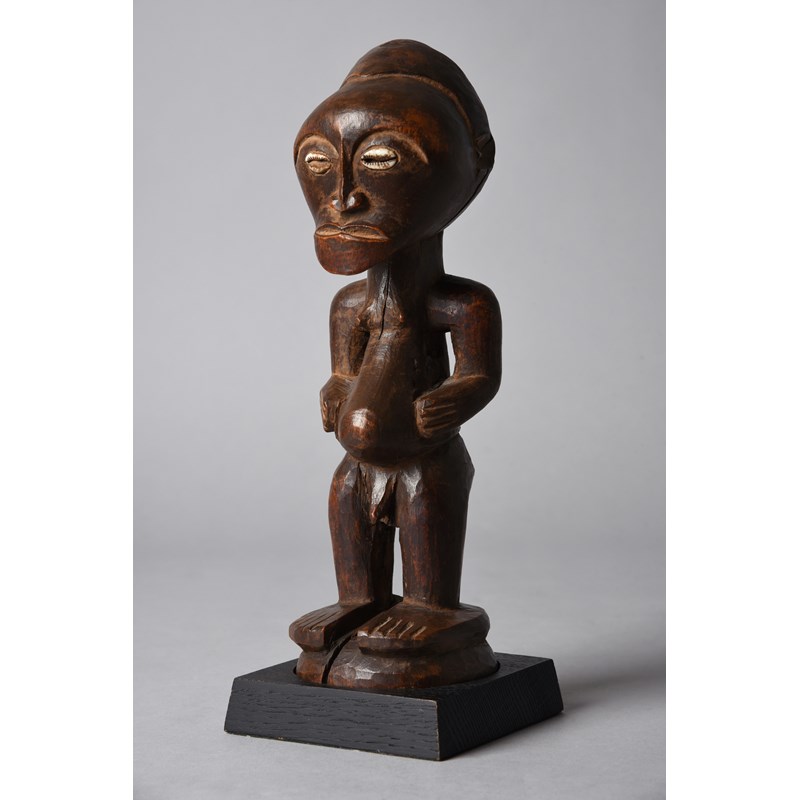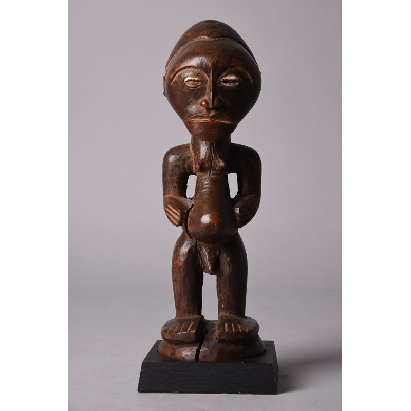 with inset cowrie shell eyes and with the hands placed on the swollen abdomen,