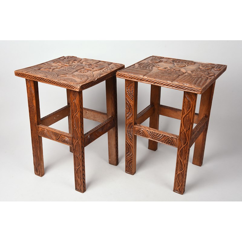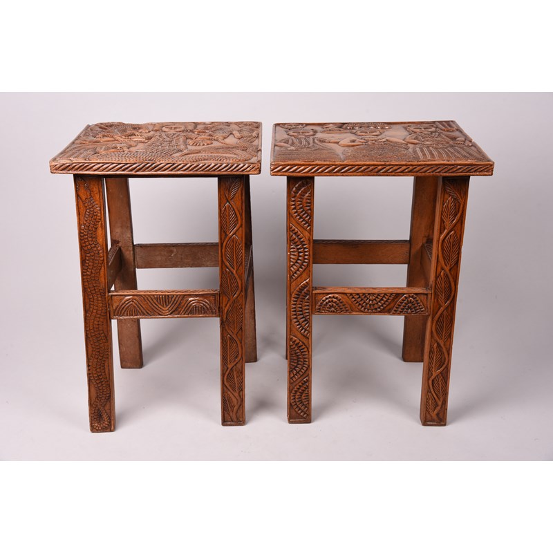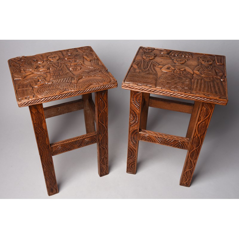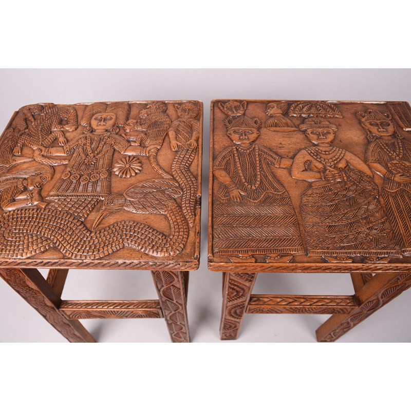 with relief carved decoration, one top with an Oba and two attendants, and the other with a central figure with a serpent and bird tail and grasping a monkey and crocodile, a figure blowing a horn and two other mythical animals, the supports carved with leaves, snakes, crescents and fish,