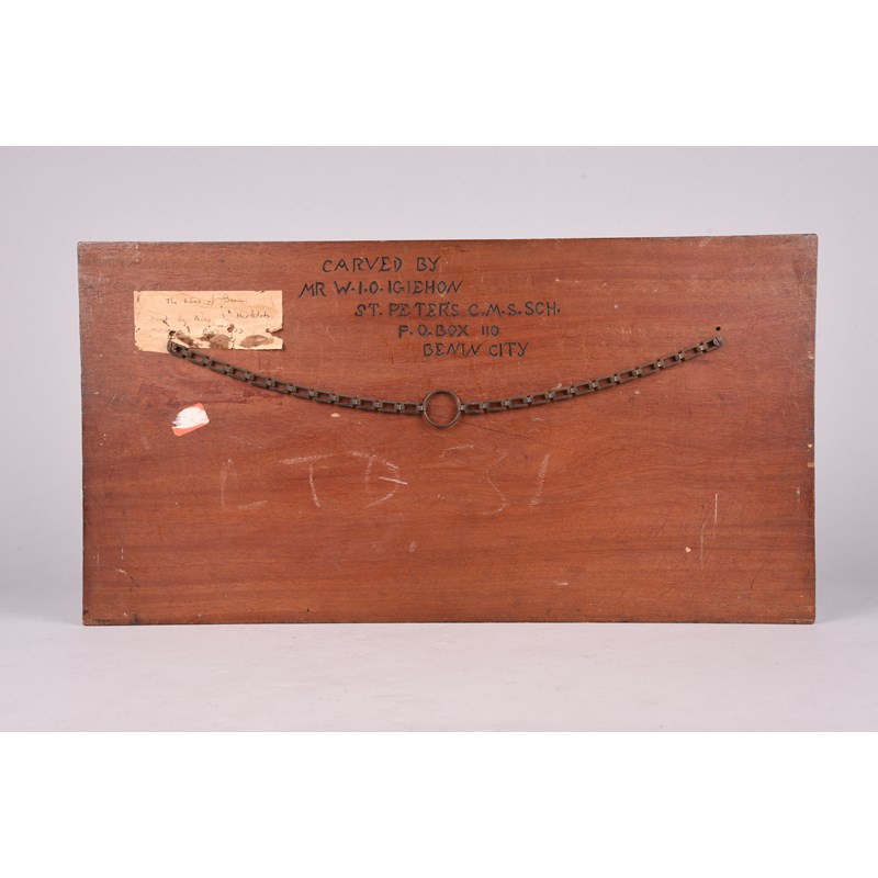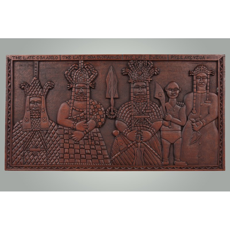 titled along the top and signed Carved by Mr W.I.O.Igiehon, St. Peter's C.M.S.SCH, P.O.Box 110, Benin City, and with a paper label inscribed The Obas of Benin, sent by Miss G Herklots, Nov. 53,
