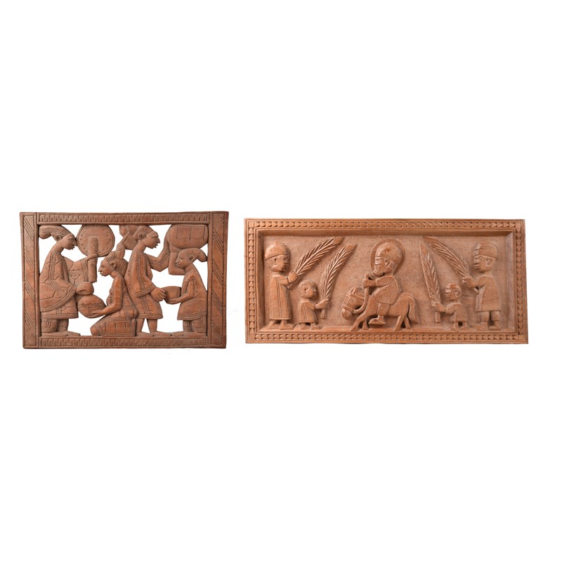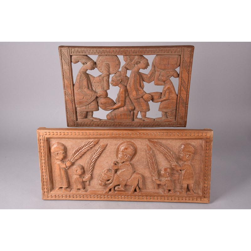 and a relief panel by S. O. Oduntan, depicting a procession, signed on the back, 27cm x 61cm. (2)