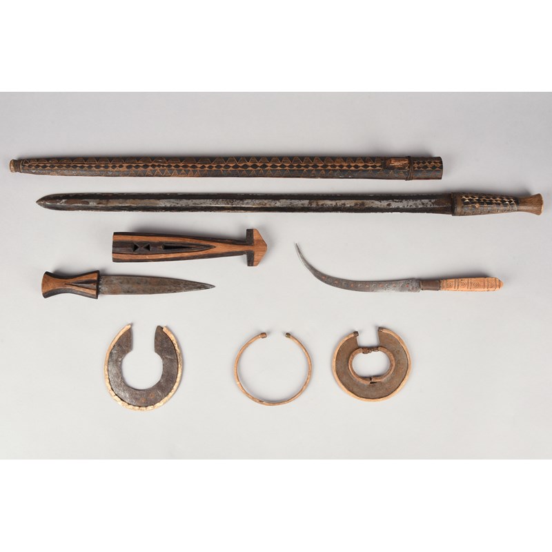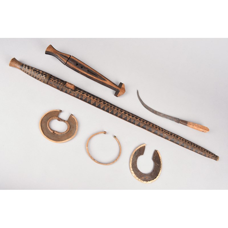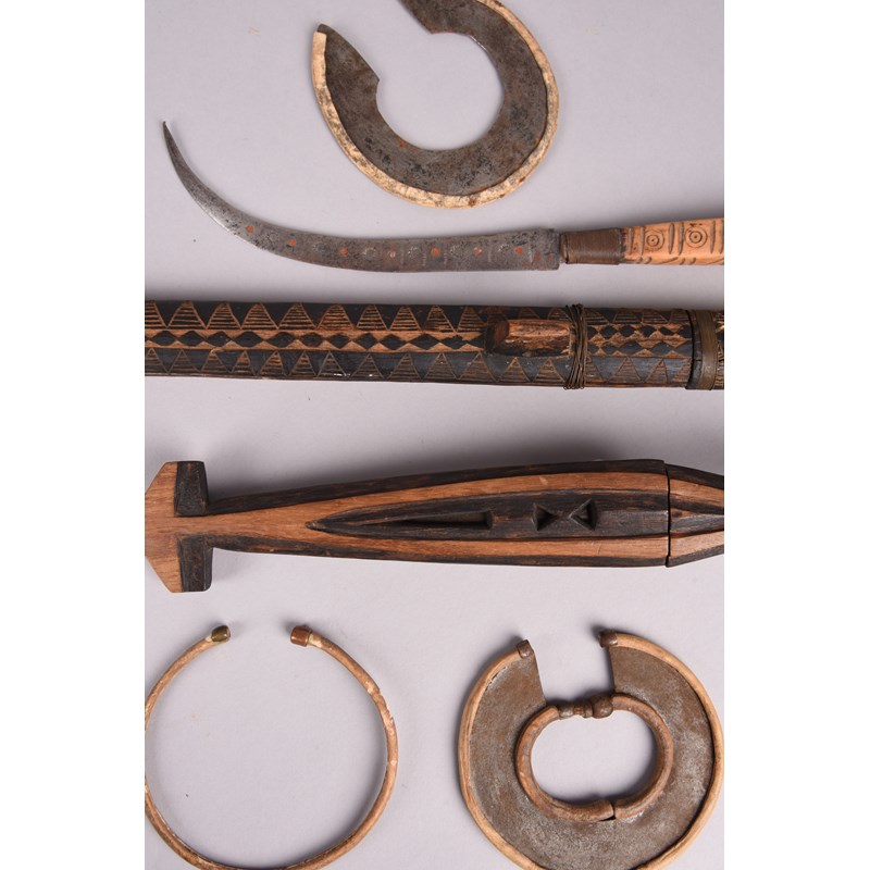 A Rwanda short sword, with a carved decorated handle and sheath, 75.7cm long, two Turkana wrist knives and a North African curved blade knife. (8)