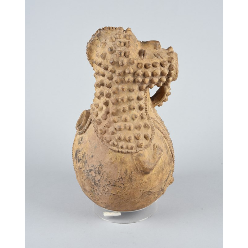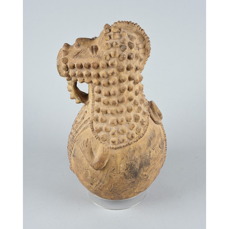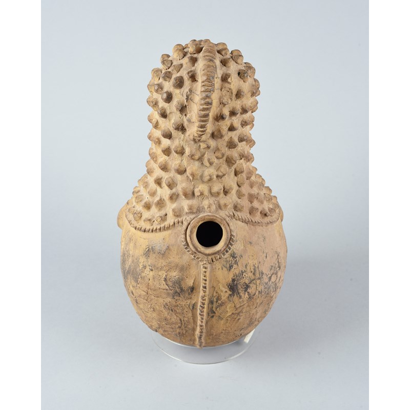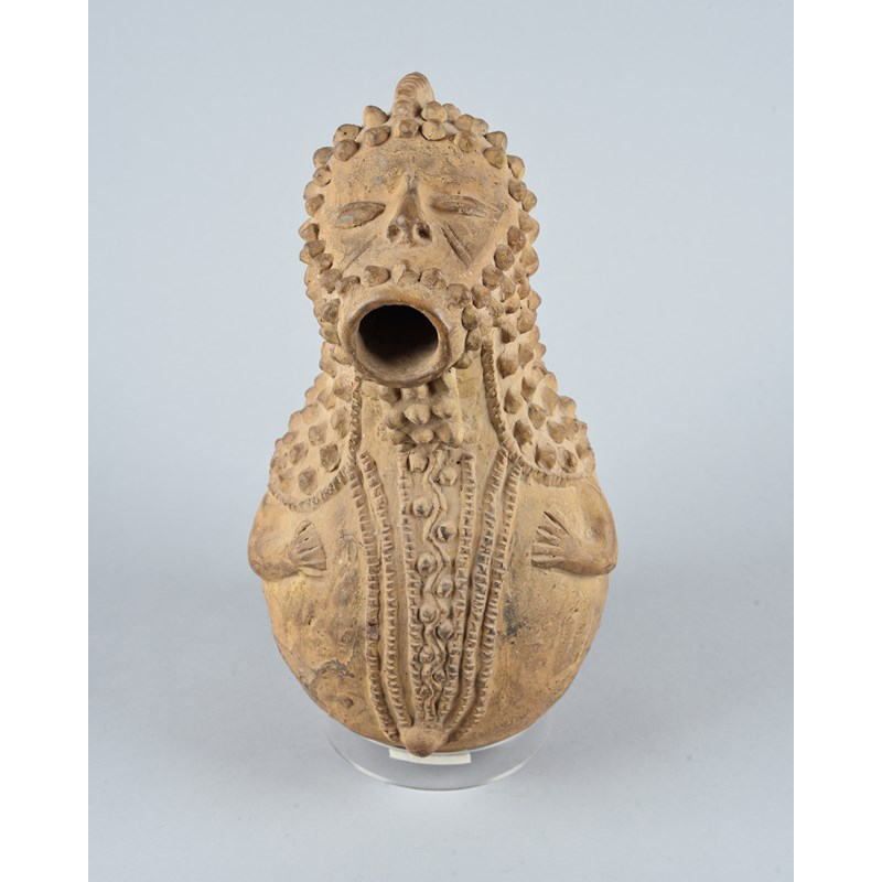 pottery, of bulbous form with relief decoration and a pair of arms, the crested head with a circular mouth and applied nodules, the back with a circular aperture,
