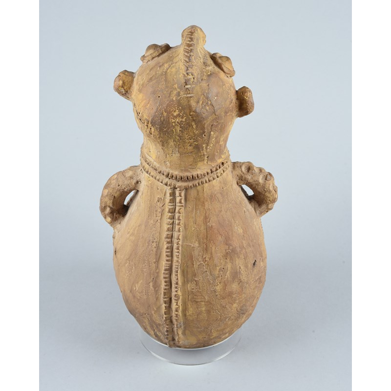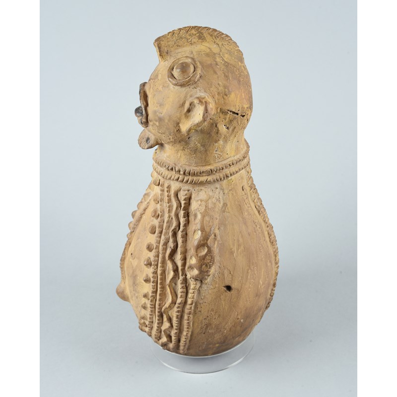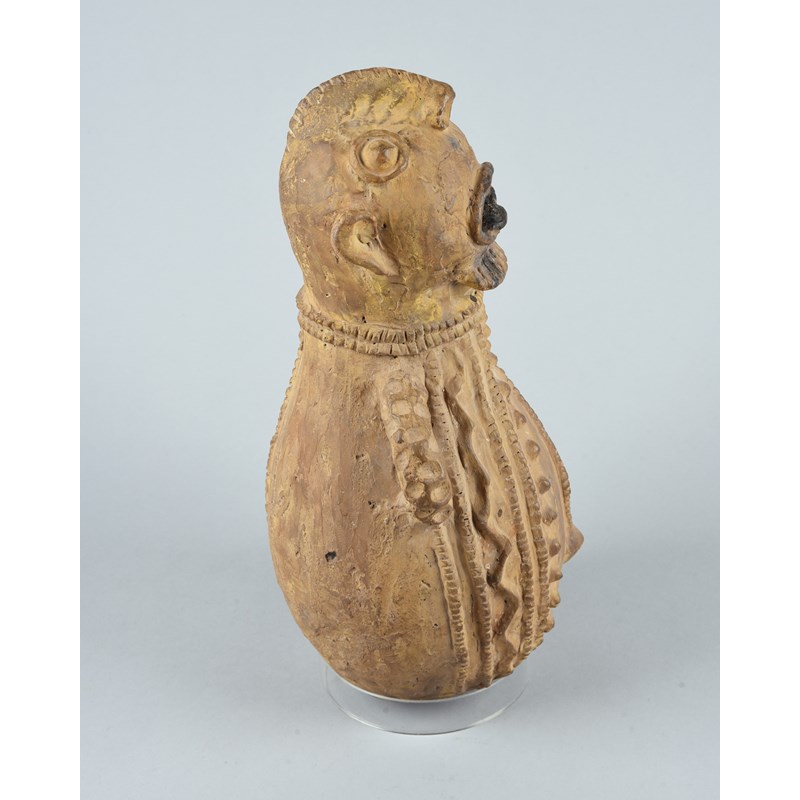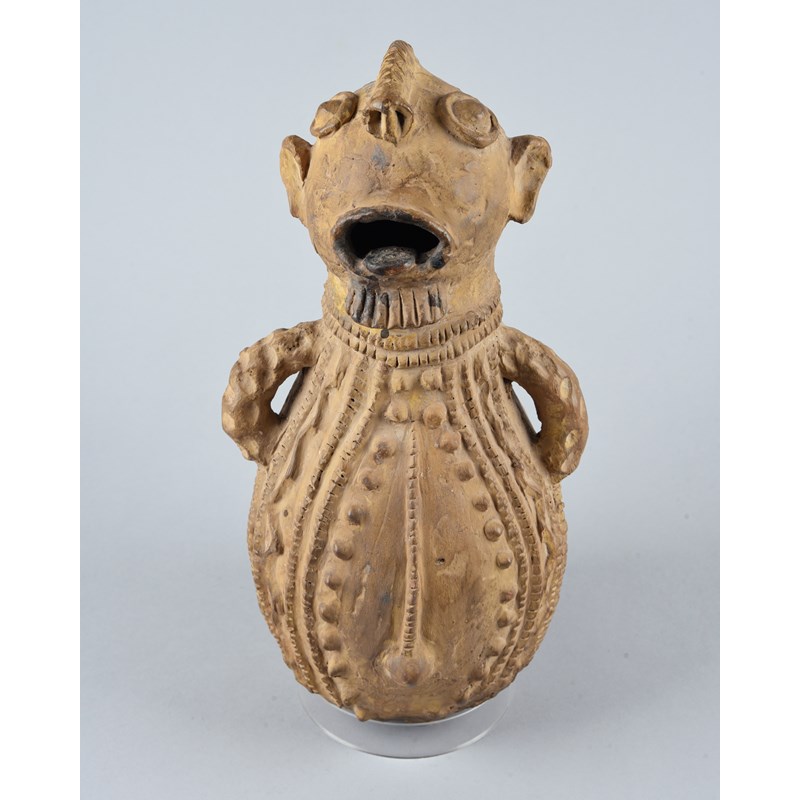 pottery, the bulbous body with applied decoration and a pair of open handles, the head with an open mouth with a tongue and beard,