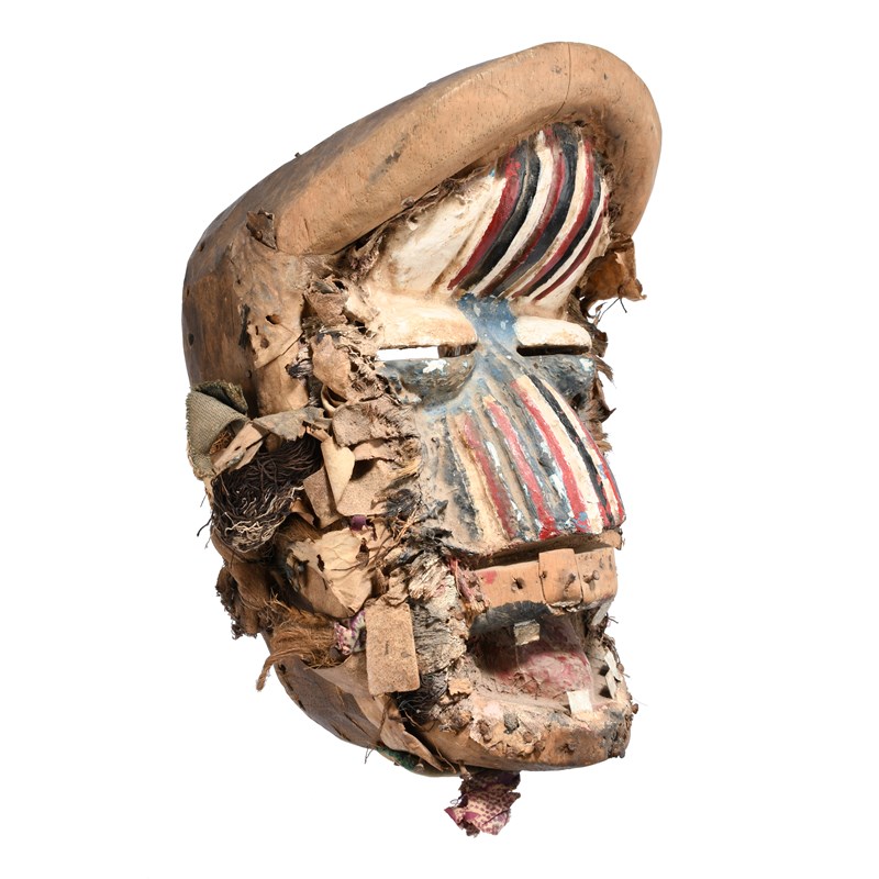 with applied hide, fabric, fibre, nails and aluminium, the grooved forehead, nose and bulging eyes with painted decoration,