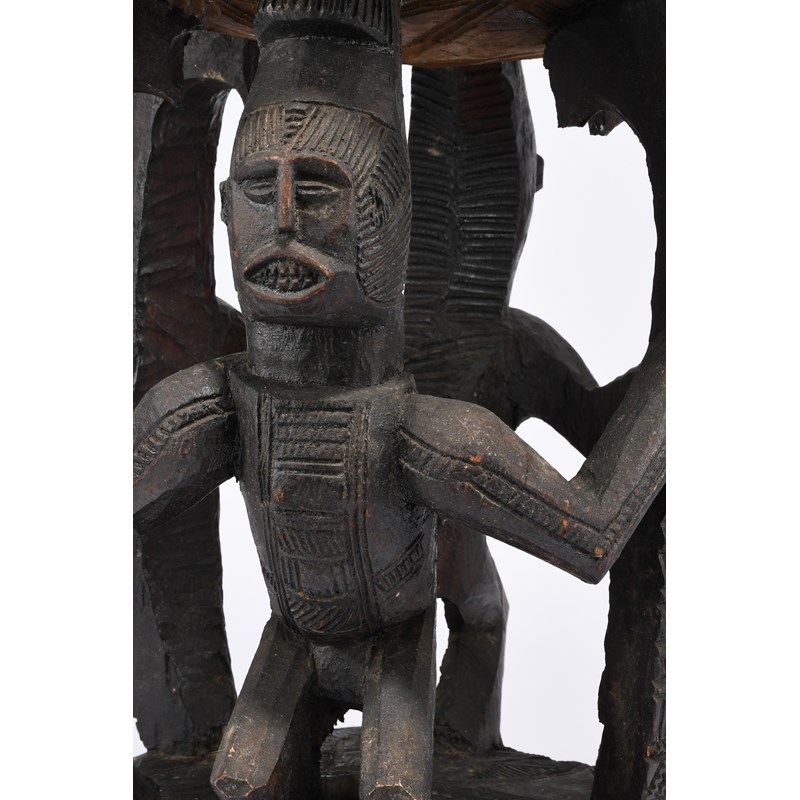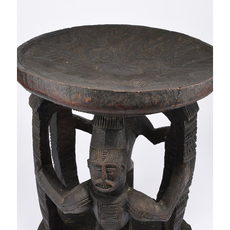 with carved geometric decoration and two standing figure supports,