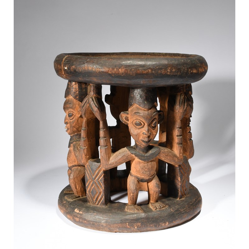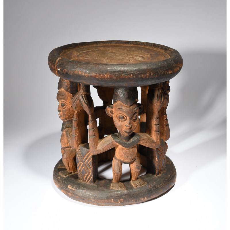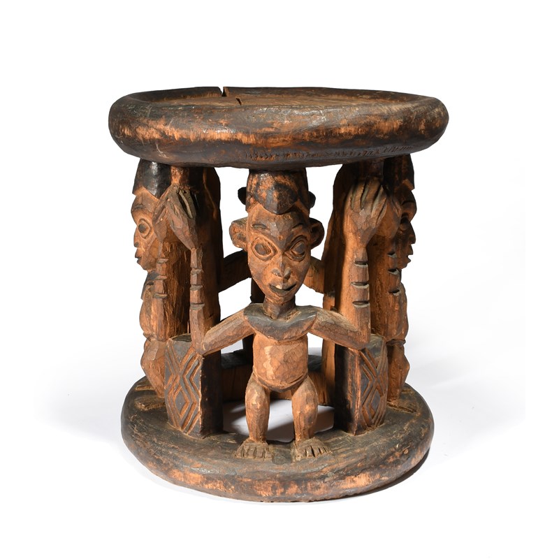 with four carved figures with raised arms resting on geometric blocks, with pokerwork detailing,