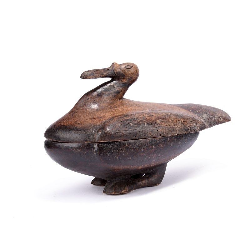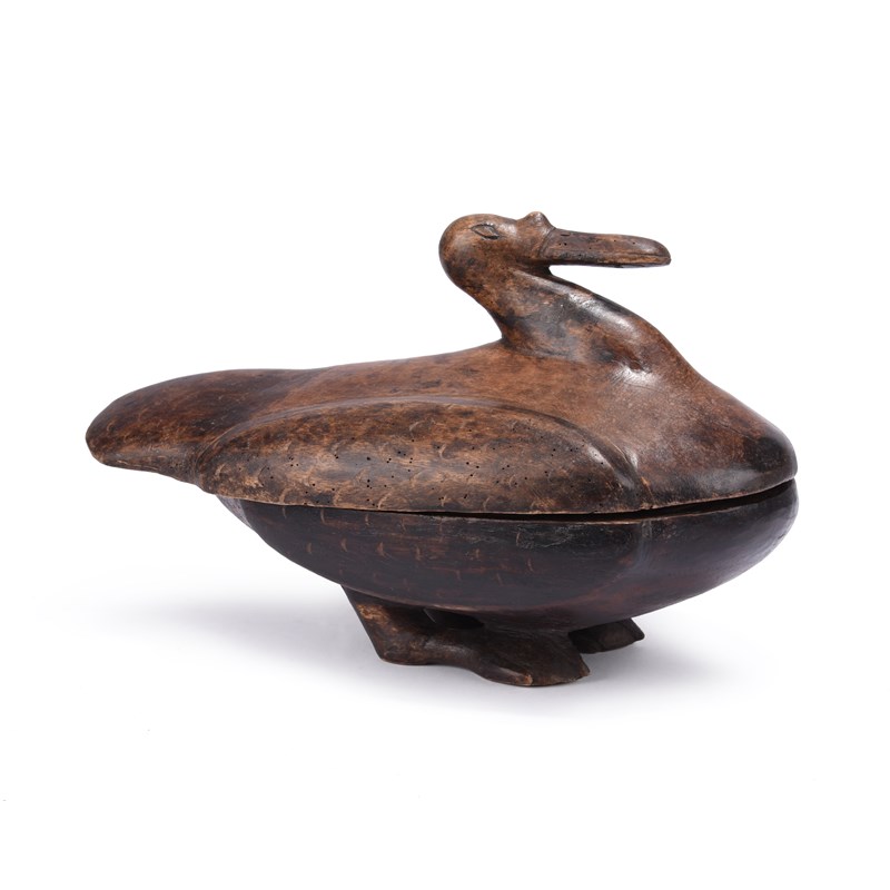 the oblong bowl on webbed feet and the possibly associated cover as a duck,