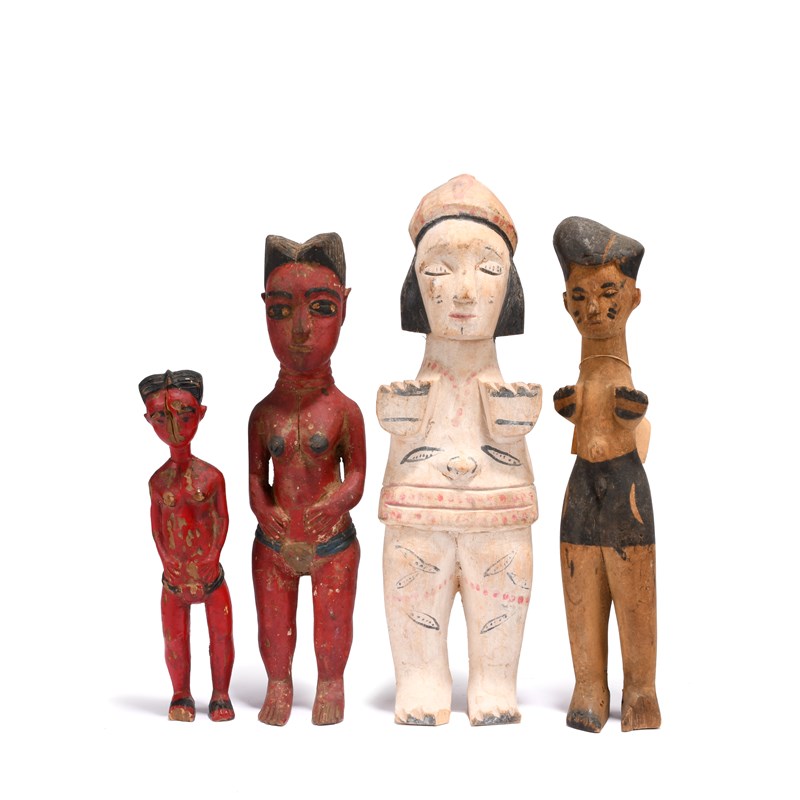 and two Baule colon figure, painted red and black, 20.5cm and 28cm high. (4)