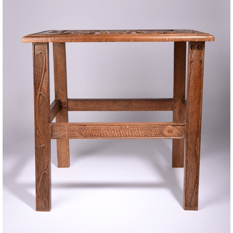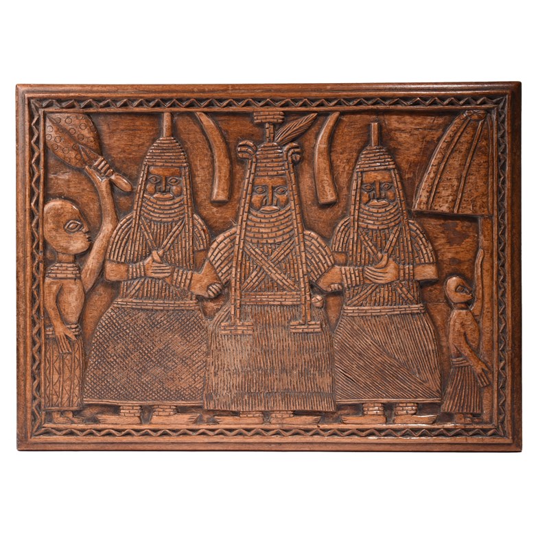 the rectangular top carved an Oba flanked by attendants, a figure by a tree and another with a fan, the supports with leaves, snakes and fish,