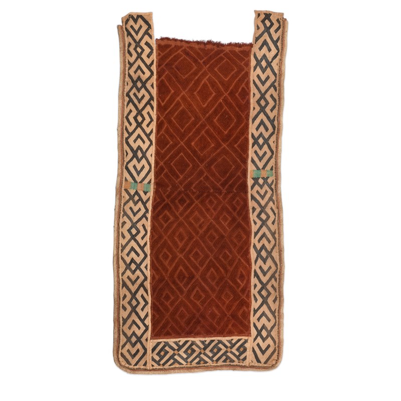 raffia, the two central panels dyed red and with cut pile and with a conforming geometric border,