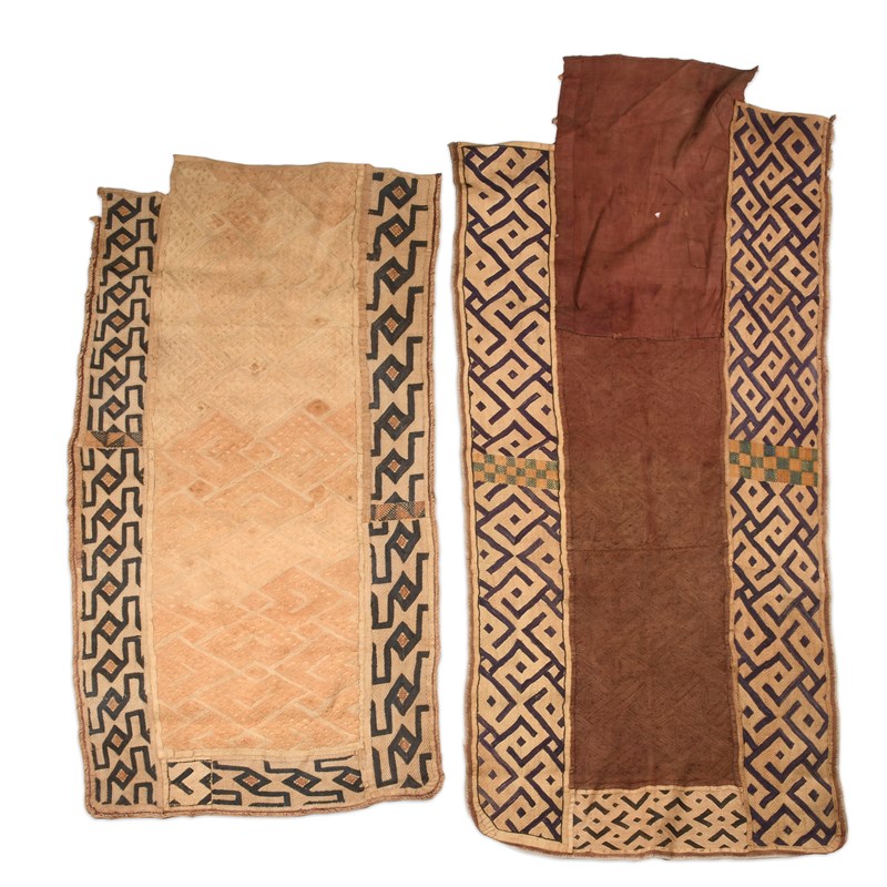 raffia, cut pile and embroidery, one with three dyed red panels, two with fine geometric patterns, the other of two panels and both with wide geometric borders,