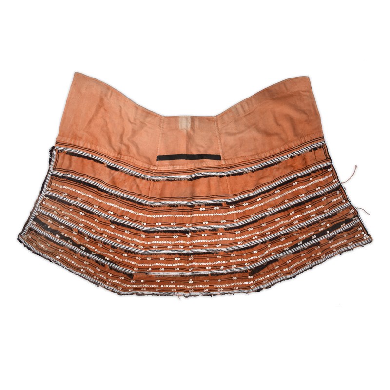 brushed cotton, white and turquoise glass beads, buttons and hide with fur and with a zip,