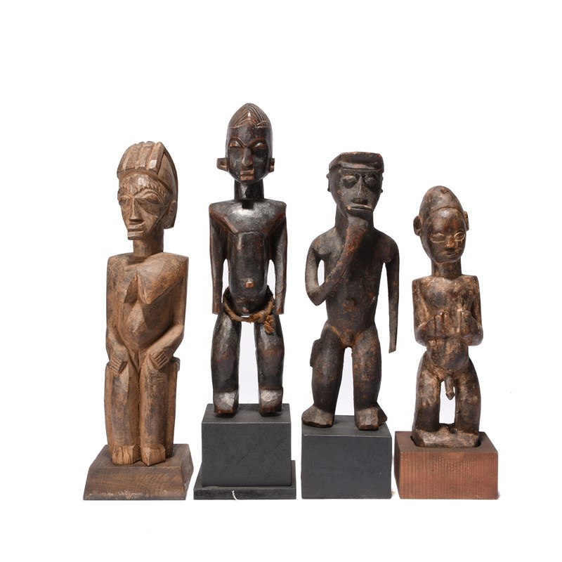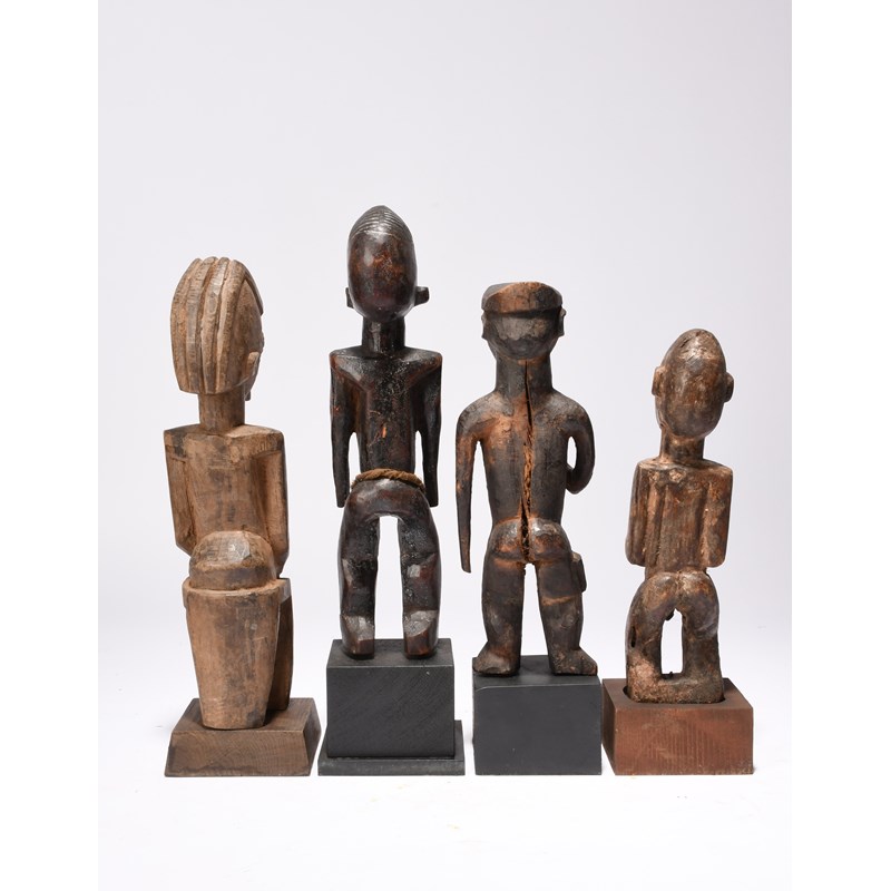 a Lobi seated female figure, 29cm high, a Lobi standing male figure, 25cm high and a West Africa standing male figure, 23.5cm high, all on bases. (8)