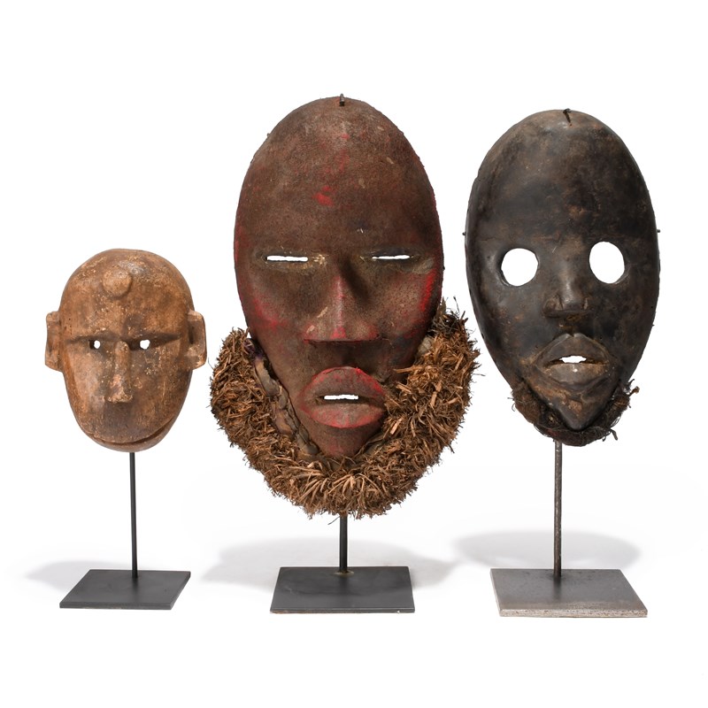 one with a red cloth cover and a fibre and cloth beard, 29cm and 24cm high, and a Makonde miniature monkey mask, 14.5cm high, all on stands. (6)
