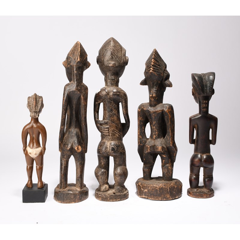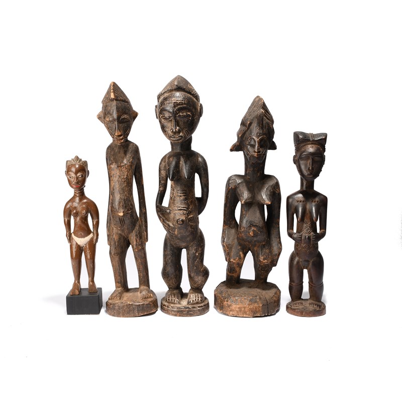 including a Baule colon female, 25cm high, on a stand, two Baule female figures, 33cm and 42cm high and two Senufo figures, 39cm and 41.5cm high. (6)