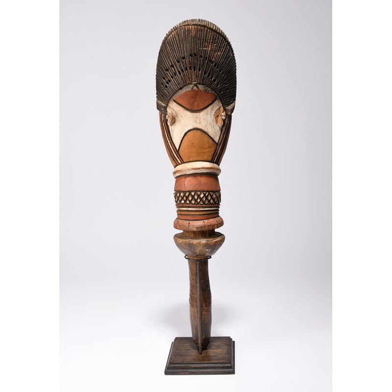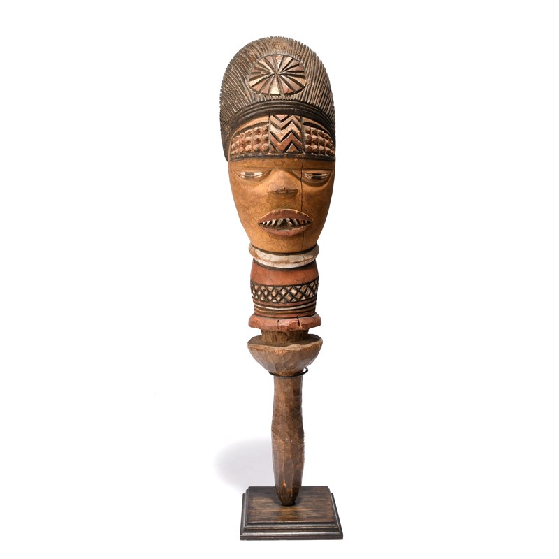 the coiffure with a radiating circle and pierced for feathers, scarifications to the forehead and with filed teeth, with pigment decoration,
