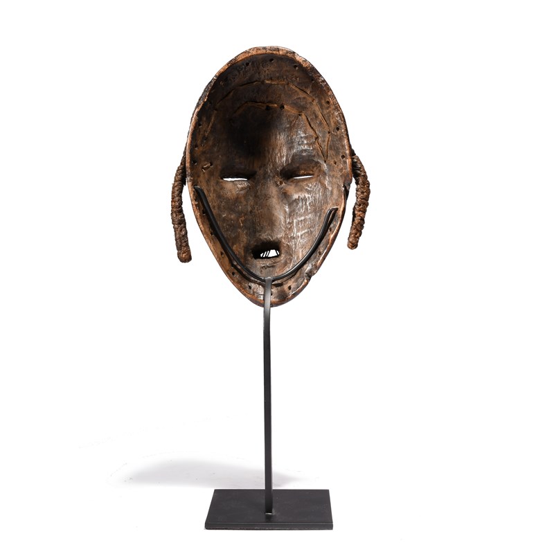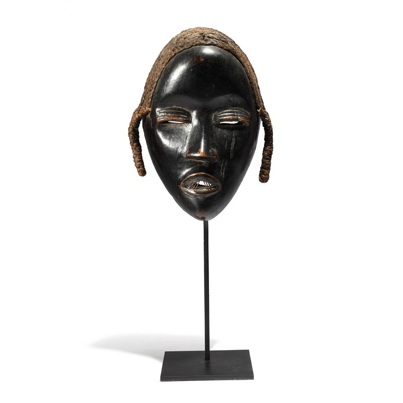 with an applied plaited fibre coiffure and an inset nail, the set back eye slits with linear carved lids and the open mouth with resin applied fibre teeth,