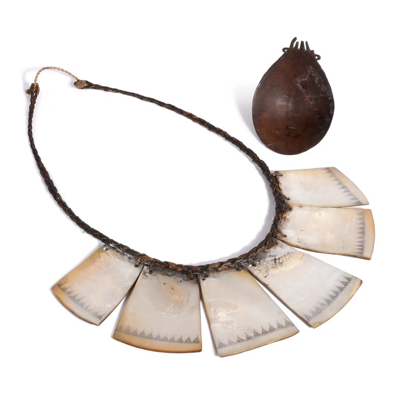 and a Papua New Guinea spoon, coconut shell with carved decoration, 10.7cm long. (2)