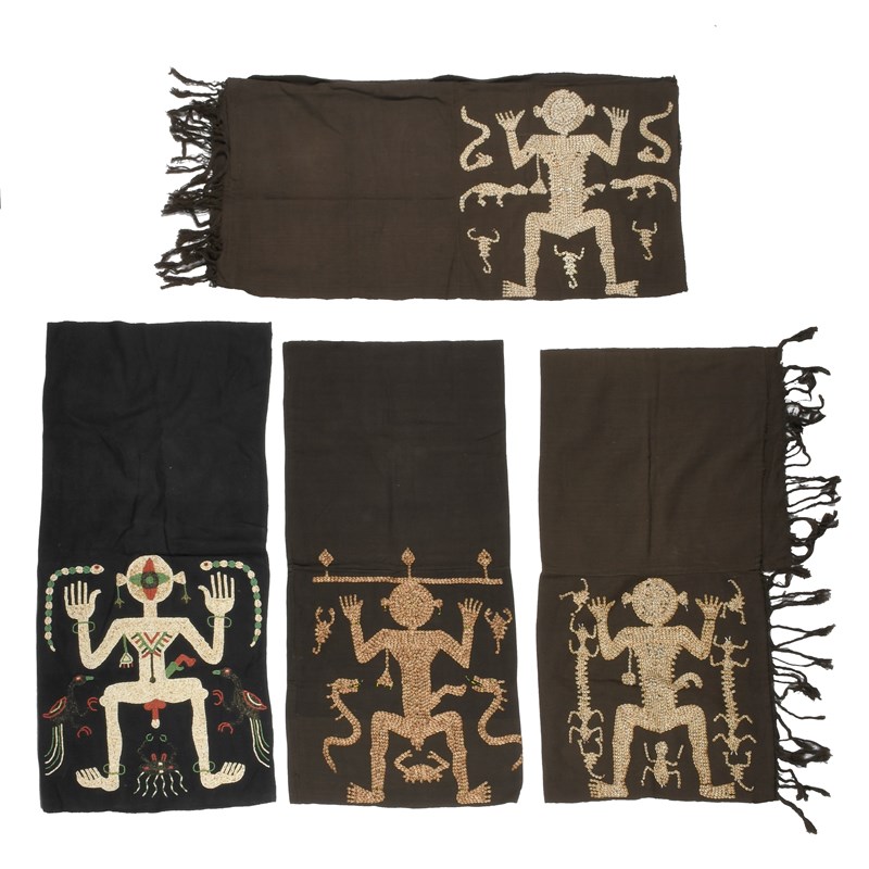 cloth with coloured glass beads, depicting a male ancestor figure with crabs, birds of paradise and serpents, on both sides,
